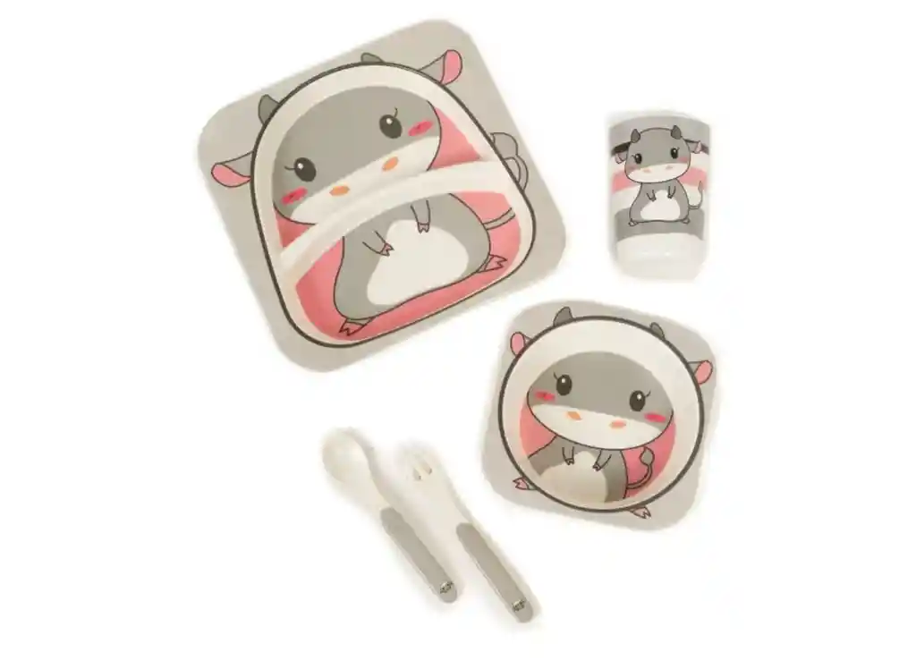 Set de vajilla infantil en bambú con diseño de vaca, compuesto por 5 piezas, ideal para acompañar la alimentación diaria de los niños de forma práctica y funcional. Su diseño atractivo hace que la hora de comer sea más agradable y motivadora. Incluye los elementos necesarios para una comida completa, ayudando a fomentar la autonomía y el aprendizaje de hábitos alimenticios desde temprana edad. Las piezas están adaptadas para un uso cómodo por parte de los niños. Fabricado en material de bambú, es ligero y resistente, adecuado para el uso frecuente en el hogar. Su superficie facilita la limpieza y el mantenimiento diario. Características principales: Set de 5 piezas para alimentación infantil Diseño de vaca atractivo para niños Material de bambú ligero y resistente Fácil de usar y limpiar Favorece la autonomía y hábitos alimenticios Producto ideal para acompañar las comidas de los niños de forma práctica y funcional.