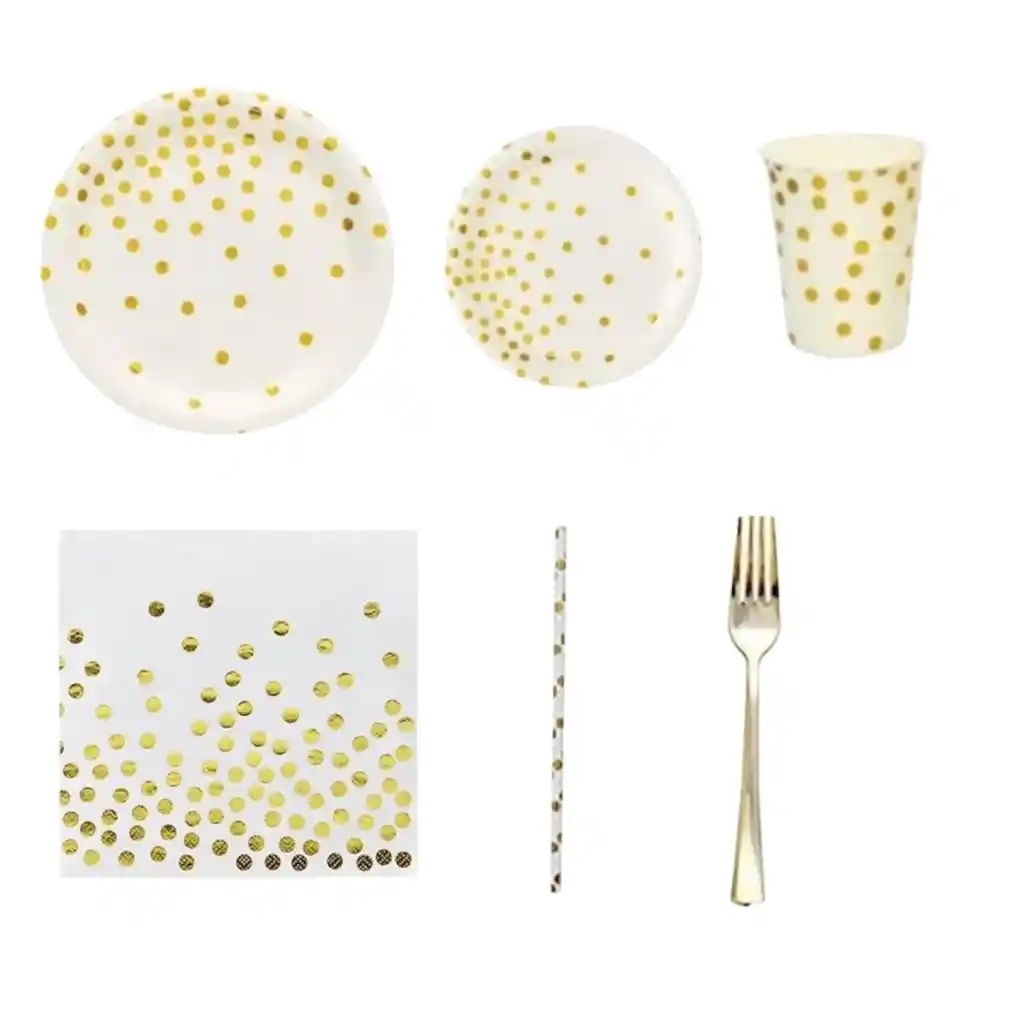 Set de vajilla desechable 6 platos pequeños blancos con puntos dorados 6 platos grandes blancos con puntos dorados 6 vasos blancos con puntos dorados 6 servillestas blancas con puntos dorados 6 pitillos blancos con puntos dorados 6 tenedores dorados TODOS LOS PRODUCTOS SON DE CARTON A EXEPCION DE LOS TENEDORES QUE SON DE PLASTICO VAJILLA DESECHABLE para celebrar el año nuevo o algun otro festejo