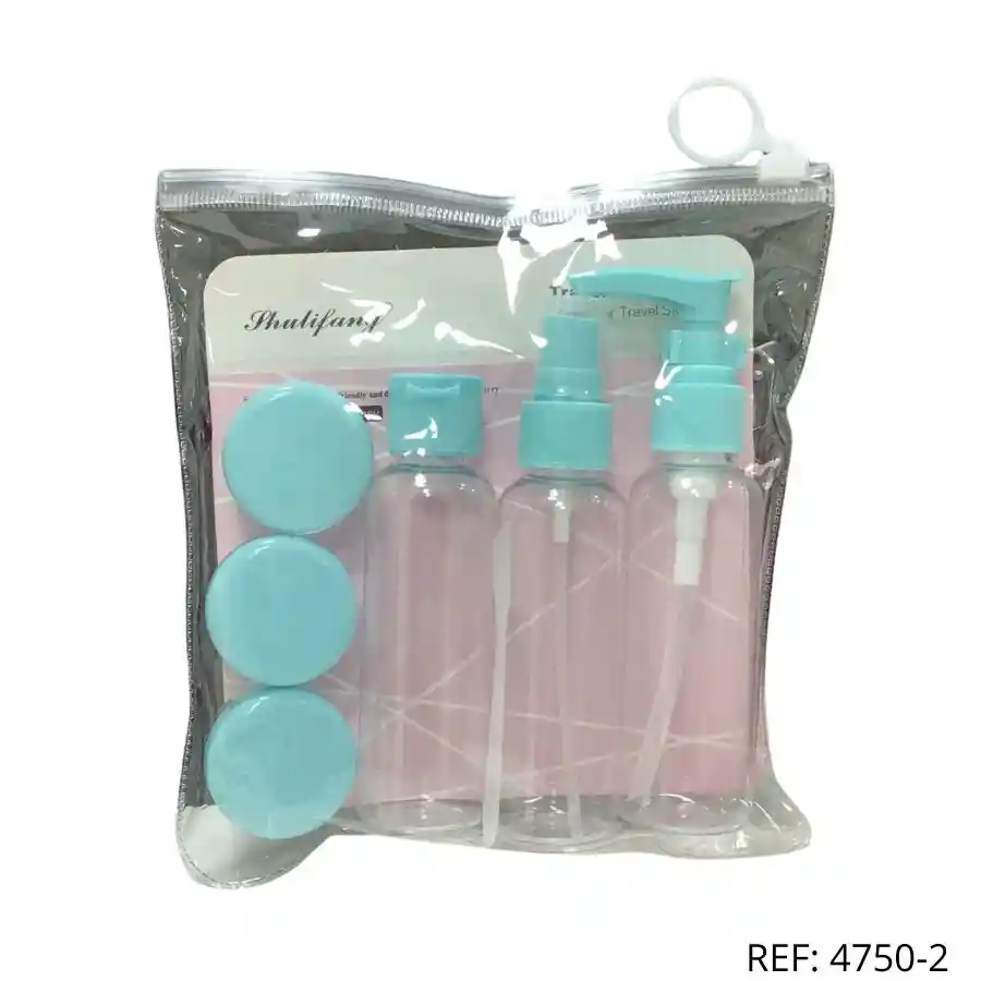 Set de viaje con botellas recargables tapa azul. Ideal para llevar shampoo, crema o perfume en tu maleta de mano.