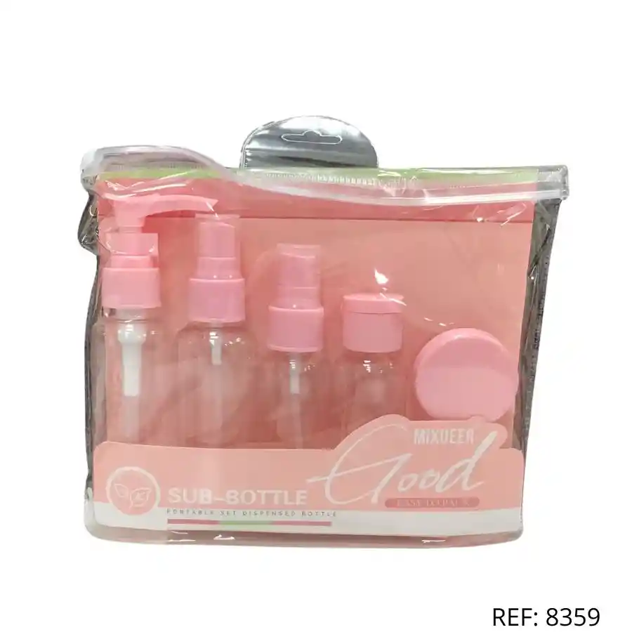 Set de botellas recargables con tapa rosada. Ideal para viajes, incluye estuche transparente y envases para líquidos y cremas.