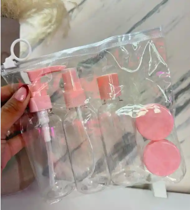 Organiza tus productos de cuidado personal de forma práctica y segura con este hermoso set viajero, ideal para llevar en la maleta, bolso o equipaje de mano ✈️. Perfecto para guardar cremas, perfumes, shampoo, acondicionador, gel, lociones y más. Su diseño compacto y funcional te permite transportar tus productos favoritos sin ocupar mucho espacio, manteniendo todo ordenado y protegido 💼✨. Características: Ideal para viajes, gimnasio o uso diario Tamaño práctico y ligero Envases reutilizables y fáciles de rellenar Perfecto para líquidos y cremas