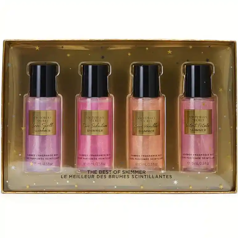 Set Victoria´s Secret brumas corporales surtidas 100% Originales. Incluye las 4 fragancias más vendidas del mercado. - Love Spell - Pure Seduction - Bare Vanilla - Velvet Petals Cada uno presentación 75ml. Producto Original.