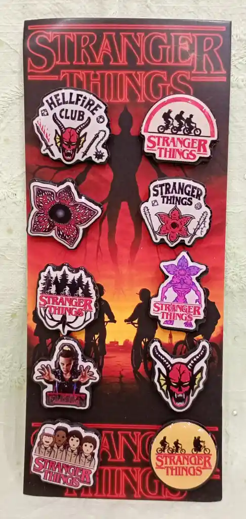 Descubre el set de 10 pines en resina de Stranger Things, una colección perfecta para los fanáticos de la serie. Cada pin tiene un diámetro de 2.5 cm y presenta un diseño circular que captura la esencia de los personajes y momentos icónicos de la trama. Hechos de resina, estos pines son ideales para personalizar tu ropa, mochilas o cualquier accesorio que desees. Con un peso de solo 20 grs, este set es fácil de llevar y almacenar. Su tamaño compacto permite que puedas llevarlos contigo a cualquier lugar, convirtiéndolos en el complemento ideal para tus salidas. Además, su diseño atractivo y colorido hará que destaques entre la multitud. Este set no solo es un excelente regalo para los amantes de Stranger Things, sino que también es una forma divertida de expresar tu pasión por la serie. Añade un toque único a tu estilo y comparte tu amor por el mundo de Hawkins con estos pines que son un must-have para cualquier fan. Somos MAJO DETALLITOS Tienda Geek Kawaii.