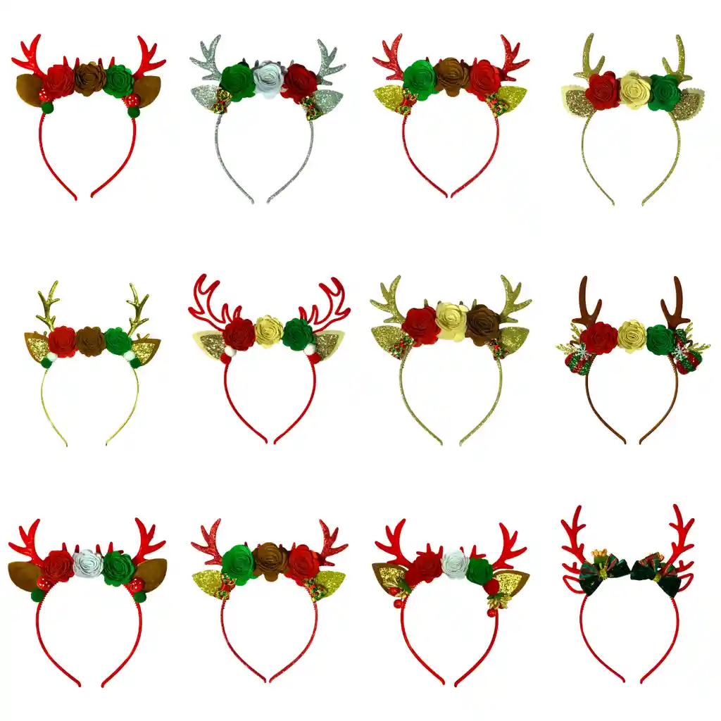 Balaca Diadema Navideña - Diseño Reno con Flores Incluye: 12 diademas navideñas Diseño: Reno con flores Colores: Surtidos Medida: Estándar Características: - Elaboración artesanal hecha a mano, con materiales de excelente calidad. - Estructura ligera, cómoda y resistente, ideal para usar durante todo el evento. - Decorada con flores de fieltro, orejas y cuernos tipo reno, y detalles brillantes que realzan su encanto navideño. Perfecta para: - Fiestas y cenas navideñas - Eventos escolares o empresariales - Sesiones de fotos familiares - Regalos o accesorios para complementar tu outfit festivo Nota: Al ser un producto artesanal hecho a mano, puede presentar ligeras variaciones en los tonos, disposición de las flores o detalles decorativos.