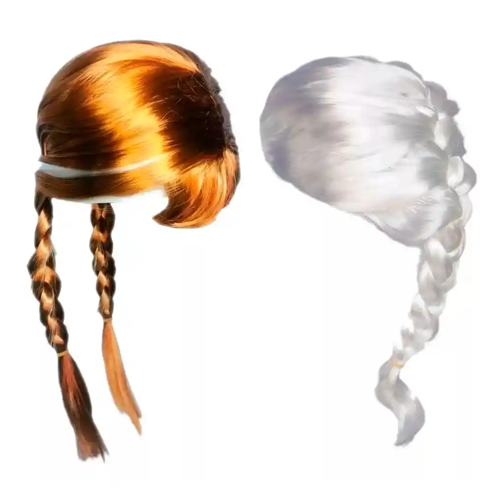 2 PELUCAS TRENZADAS DE ELSA Y ANNA DE FROZEN CARACTERISTICAS: PELUCA ELSA: • Peluca lisa con trenza • largo 54m • color: BLANCO • 180 gr • Material: Fibra sintética PELUCA ANNA: • Peluca lisa con 2 trenzas y fleco • largo 34cm • colores: BLANCO • 202 gr • Material: Fibra sintética • Cómoda de usar incluso durante largos períodos de tiempo. • accesorio es perfecto para cumpleaños, Halloween, fiestas de disfraces, hora loca, celebraciones, eventos...