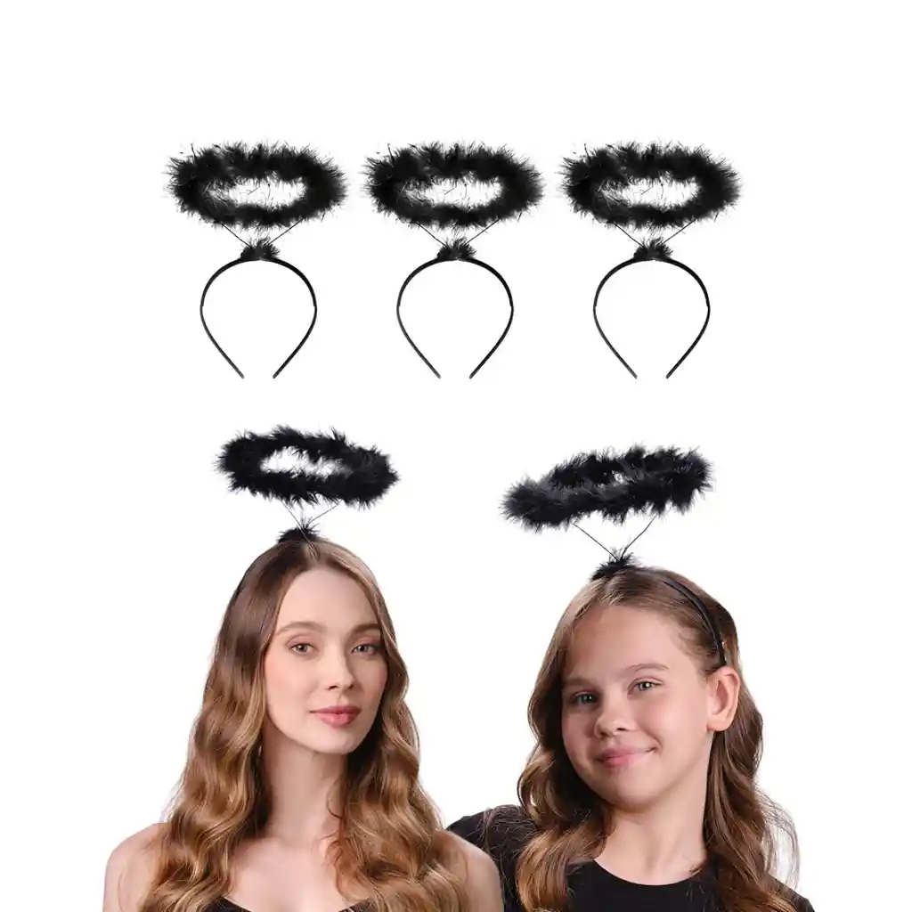 Diadema Ángel con Aureola de Plumas Disfraz Halloween Incluye: 3 diademas Color: Negro Material: Plumas sintéticas, banda flexible y cómoda Talla: Única Perfectas para: - Disfraces de ángel o hada - Ángeles caídos o looks oscuros - Sesiones de fotos temáticas - Obras escolares y fiestas de disfraces Combínalas con un vestido blanco o negro, alas y maquillaje acorde para crear un personaje celestial o misterioso.