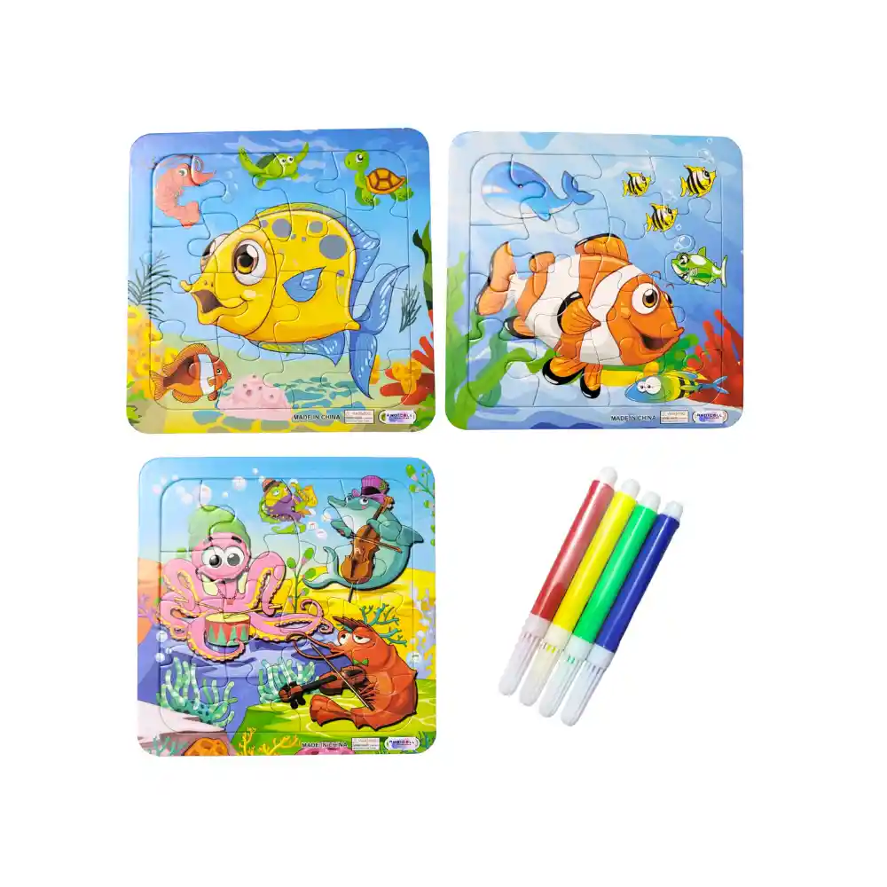 Set de Rompecabezas para Armar, Colorear y Pintar para Niños Incluye: 1 set de 3 rompecabezas (16 piezas c/u) + 4 mini marcadores Tamaño: 14 cm x 14 cm Material: Cartón Diseño: Mundo marino Este increíble kit incluye tres rompecabezas pequeños que los niños podrán armar y pintar a su gusto. Además, viene con 4 mini marcadores en colores vibrantes para que puedan dar rienda suelta a su creatividad. Perfecto para estimular la imaginación, la concentración y la coordinación motora. ¡Un regalo perfecto que combina juego, arte y aprendizaje en un solo set!