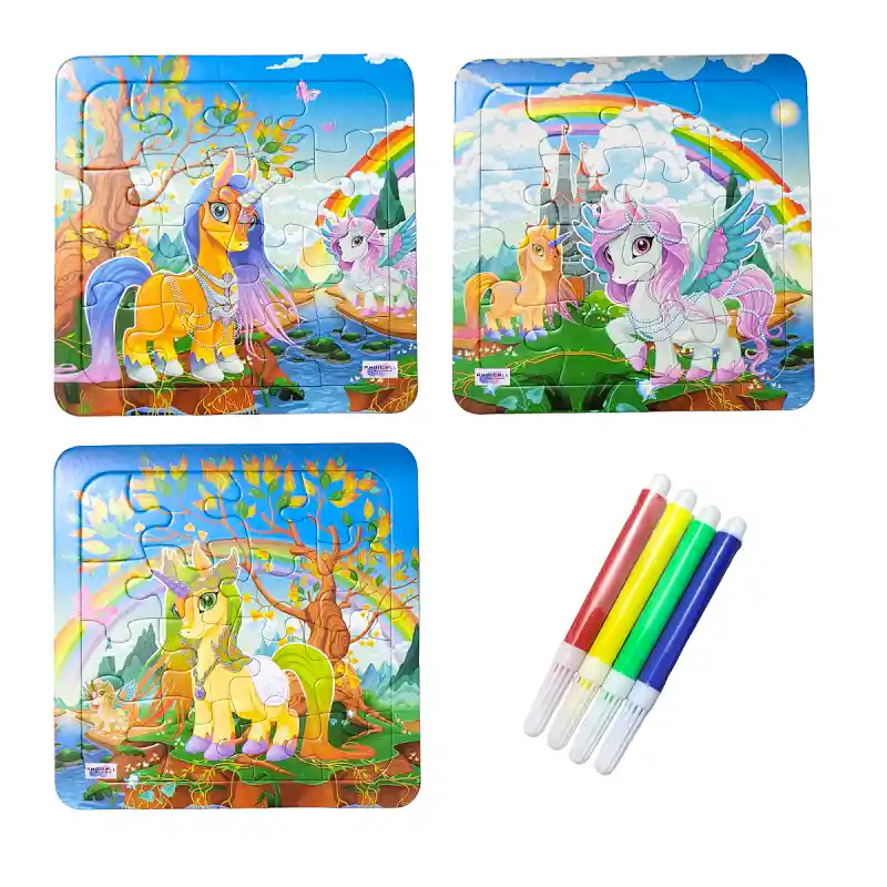 Set de Rompecabezas para Armar, Colorear y Pintar para Niños Incluye: 1 set de 3 rompecabezas (16 piezas c/u) + 4 mini marcadores Tamaño: 14 cm x 14 cm Material: Cartón Diseño: Pony Este increíble kit incluye tres rompecabezas pequeños que los niños podrán armar y pintar a su gusto. Además, viene con 4 mini marcadores en colores vibrantes para que puedan dar rienda suelta a su creatividad. Perfecto para estimular la imaginación, la concentración y la coordinación motora. ¡Un regalo perfecto que combina juego, arte y aprendizaje en un solo set!