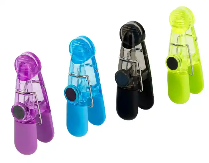 Incluye cuatro (4) clips multipropósito en colores surtidos. Están construidos en plástico resistente y liviano. Incluyen un imán en la parte posterior para pegarlo a superficies metálicas fácilmente.