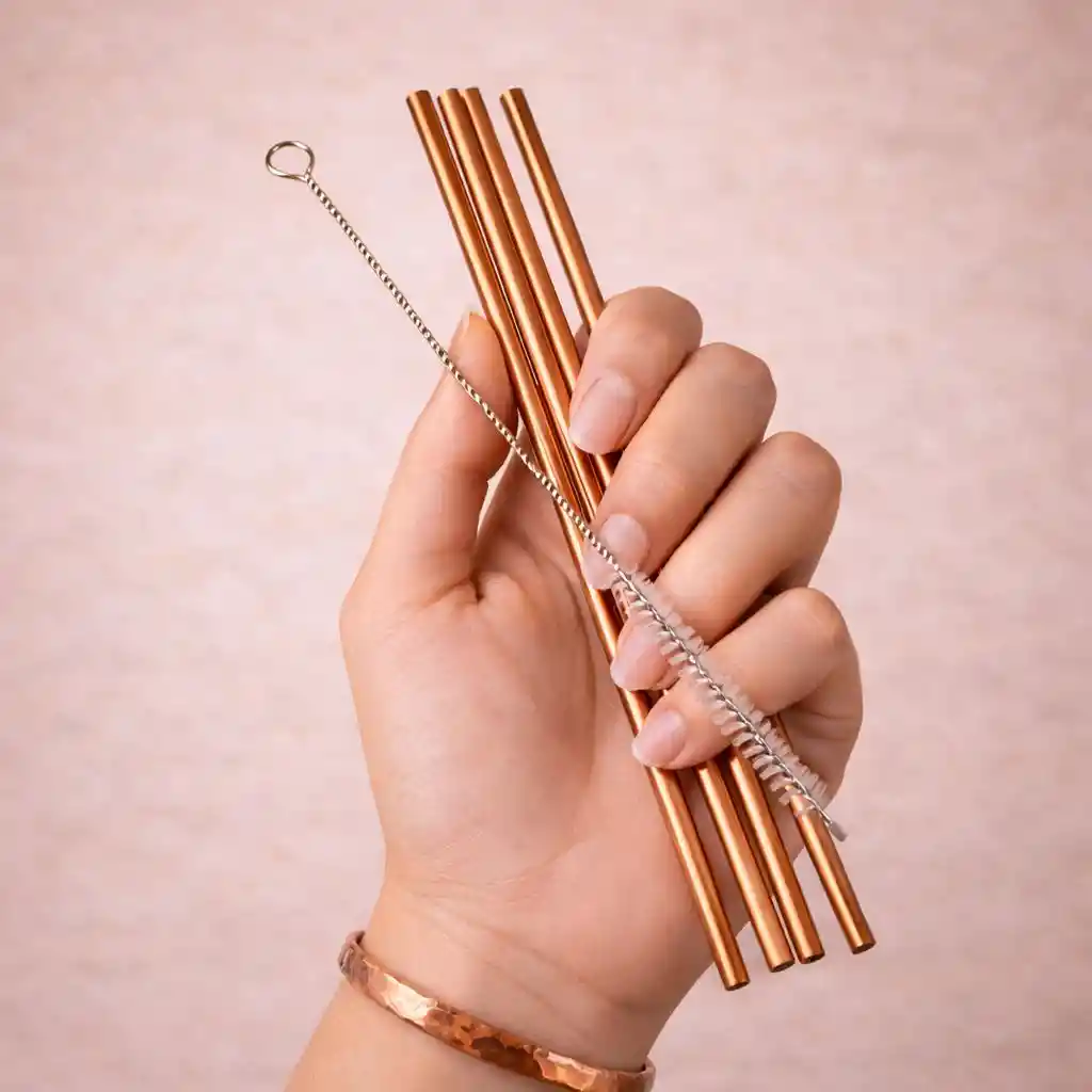 Los pitillos de cobre son un sustituto reutilizable, saludable y respetuoso con el medio ambiente. Es ideal para todo tipo de cócteles, batidos y otras bebidas. El cobre tiene propiedades inmunitarias, anti-envejecimiento, antioxidantes y anti-cancerígenos. Los plásticos liberan BPA, un producto químico que imita el estrógeno, haciendo que el cambio al cobre sea una opción mucho más saludable. No solo son estéticamente atractivos, sino que también mejora los aromas cuando se utiliza con cócteles. Hecho de cobre sólido 99,9% puro. Set de 4 pitillos de cobre con limpiador.