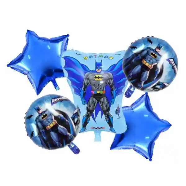 Funciones y detalles 5 unidades •Figura Batman: Alto:98cm Ancho:51cm •2 Globos Personaje Batman 45 cm , cada uno •2 Globos Estrellas: 45 cm , cada uno Papel de aluminio
