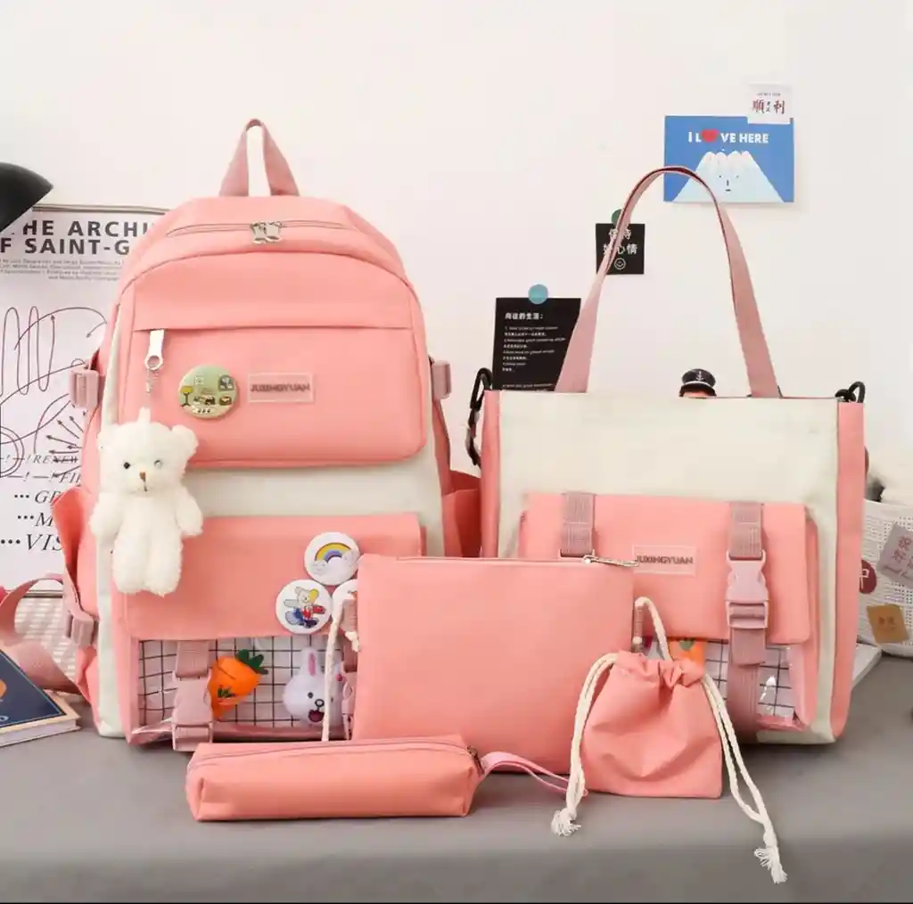 Este set de 5 mochilas y bolsos escolares, está confeccionado en lona liviana de alta calidad, lo que garantiza su resistencia y durabilidad. Cuenta con costuras fuertes y correas de hombro robustas, lo que asegura su capacidad para soportar un gran peso. Las mochilas y bolsas ofrecen una capacidad de aproximadamente 30 litros, lo que las hace ideales para guardar tus pertenencias diarias. Son lo suficientemente amplias para alojar computadoras portátiles, libros y otros accesorios. El diseño inteligente permite aprovechar al máximo el espacio interno. Son lo suficientemente grandes para almacenar bolígrafos, lápices y otros útiles escolares o de oficina. Además, pueden tener otros usos, como bolsas de viaje o estuches de cosméticos. Estas mochilas escolares son ideales para niñas, niños, adolescentes, damas y caballeros. Son perfectas para la escuela, la universidad, actividades al aire libre, deportes, camping, senderismo, viajes, etc. Tu compra incluye 5 piezas morral, bolso, cosmetiquera, cartuchera y bolsita Disponible: negro, rosado, morado y azul