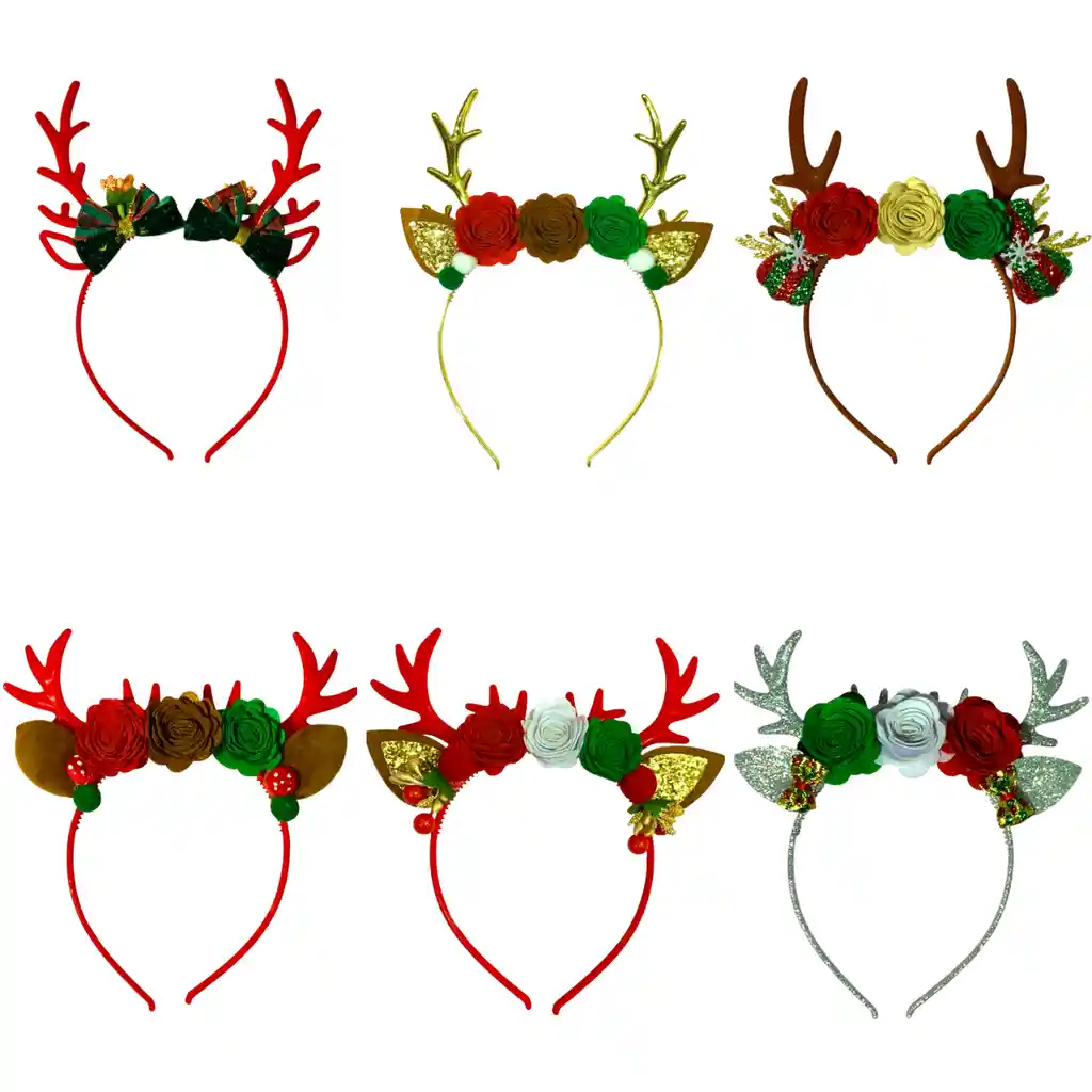 Balaca Diadema Navideña - Diseño Reno con Flores Incluye: 6 diademas navideñas Diseño: Reno con flores Colores: Surtidos Medida: Estándar Características: - Elaboración artesanal hecha a mano, con materiales de excelente calidad. - Estructura ligera, cómoda y resistente, ideal para usar durante todo el evento. - Decorada con flores de fieltro, orejas y cuernos tipo reno, y detalles brillantes que realzan su encanto navideño. Perfecta para: - Fiestas y cenas navideñas - Eventos escolares o empresariales - Sesiones de fotos familiares - Regalos o accesorios para complementar tu outfit festivo Nota: Al ser un producto artesanal hecho a mano, puede presentar ligeras variaciones en los tonos, disposición de las flores o detalles decorativos.