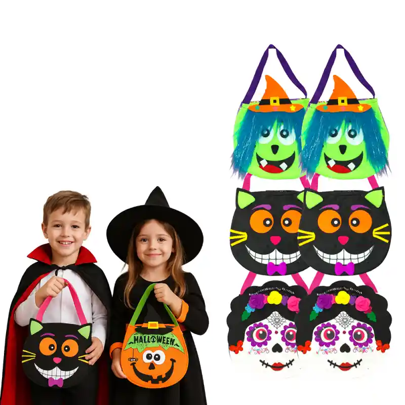 Bolsos para Dulces Halloween Día de los Niños Incluye: 6 bolsos Material: Fieltro Medidas: 32 x 29 cm (cada bolso) Diseño: Surtidos Características: - Diseños divertidos y coloridos: Cada bolso cuenta con estampados en relieve y detalles llamativos que encantan a los niños. - Asas firmes y cómodas: Ideales para que los pequeños puedan llevar sus dulces sin dificultad. - Versátiles y temáticos: Perfectos para recolectar caramelos en Halloween, usar en fiestas temáticas o incluso como decoración. - Tamaño grande: Con amplio espacio para guardar muchos dulces y sorpresas. Con estas bolsas, tus pequeños disfrutarán de un Halloween lleno de magia y diversión, ¡llevando sus dulces con estilo!