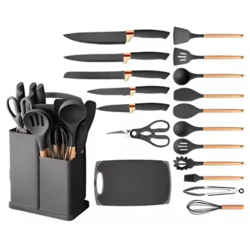 Elegancia y Eficiencia en tu Cocina: Set de 19 Utensilios Para Cocina Con Soporte y Tabla Para Picar Nuestro set es la combinación perfecta de funcionalidad y estilo. Equipa tu cocina con estas herramientas esenciales y transforma la forma en que preparas tus comidas. Características Principales: Variedad de Cuchillos: Este set incluye una selección de 5 cuchillos, cucharones, espátulas, pinzas, cucharas de medir, batidores y mucho más para satisfacer todas tus necesidades en la cocina. Soporte Elegante: El soporte incluido no solo mantiene tus cuchillos organizados y al alcance, sino que también agrega un toque de estilo a tu cocina. Mantén tus herramientas a la vista y ordenadas. Tabla de Picar de Calidad: La tabla de picar incluida es duradera y resistente, proporcionando una superficie estable para cortar tus ingredientes. Su tamaño ideal te permite cortar y picar de manera eficiente. Mango Ergonómico: Los mangos de los cuchillos están diseñados para ofrecer un agarre cómodo y seguro, lo que facilita el manejo y control durante el uso. El Set incluye – 1 Cucharón sopero – 1 Cuchara escurridora – 1 Cuchara sólida – 1 Cuchara raspadora – 1 Raspador – 1 Servidor de pasta – 1 Espátula ranurada – 1 Espátula sólida – 1 Cepillo para aceite – 1 Pinza – 1 Batidor – 1 Cuchillo de chef – 1 Cuchillo para pan – 1 Cuchillo universal – 1 Cuchillo multiusos – 1 Cuchillo para pelar – 1 Tijeras – 1 Tabla para cortar – 1 Bloque para cuchillos y porta utensilios