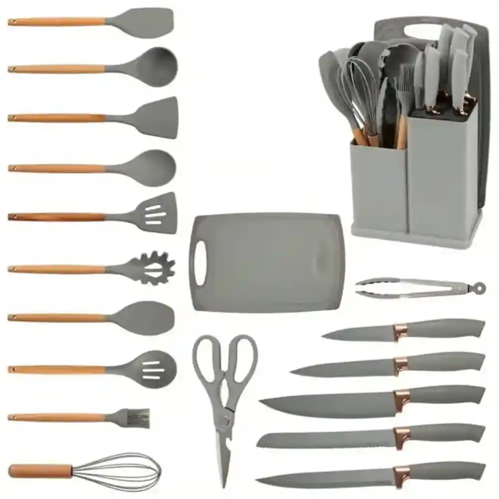 Elegancia y Eficiencia en tu Cocina: Set de 19 Utensilios Para Cocina Con Soporte y Tabla Para Picar Nuestro set es la combinación perfecta de funcionalidad y estilo. Equipa tu cocina con estas herramientas esenciales y transforma la forma en que preparas tus comidas. Características Principales: Variedad de Cuchillos: Este set incluye una selección de 5 cuchillos, cucharones, espátulas, pinzas, cucharas de medir, batidores y mucho más para satisfacer todas tus necesidades en la cocina. Soporte Elegante: El soporte incluido no solo mantiene tus cuchillos organizados y al alcance, sino que también agrega un toque de estilo a tu cocina. Mantén tus herramientas a la vista y ordenadas. Tabla de Picar de Calidad: La tabla de picar incluida es duradera y resistente, proporcionando una superficie estable para cortar tus ingredientes. Su tamaño ideal te permite cortar y picar de manera eficiente. Mango Ergonómico: Los mangos de los cuchillos están diseñados para ofrecer un agarre cómodo y seguro, lo que facilita el manejo y control durante el uso. El Set incluye – 1 Cucharón sopero – 1 Cuchara escurridora – 1 Cuchara sólida – 1 Cuchara raspadora – 1 Raspador – 1 Servidor de pasta – 1 Espátula ranurada – 1 Espátula sólida – 1 Cepillo para aceite – 1 Pinza – 1 Batidor – 1 Cuchillo de chef – 1 Cuchillo para pan – 1 Cuchillo universal – 1 Cuchillo multiusos – 1 Cuchillo para pelar – 1 Tijeras – 1 Tabla para cortar – 1 Bloque para cuchillos y porta utensilios
