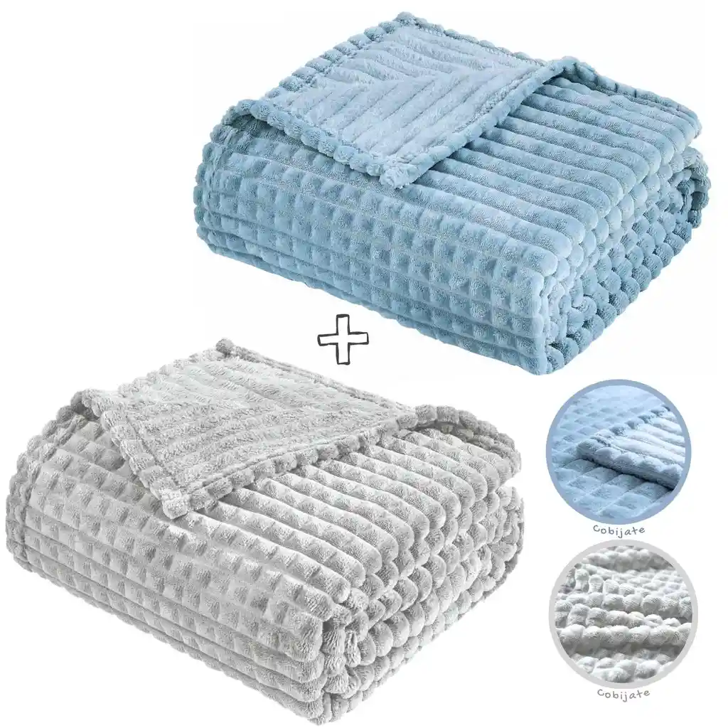Nuestras cobijas térmicas son una maravilla en épocas de frío. Te mantendrán calentito, debido a su material con tecnología de calor liviano, te sentirás como en una nube de algodón. Especificaciones: - Tipo: Cobijas y mantas - Color: Azul Grisáceo y Gris Claro - Set x2 unidades - Elaborado en poliéster. - Suave al tacto. - Cama Doble - Marca: Cobijate Recomendaciones: * Lavar antes de su primer uso. * Lavado a temperatura fría. * Lavado a máquina ciclo delicado. * No blanquear con cloro Empaque: Cobijas dobladas en rollito y envueltas con papel kraff o bolsa. ¡Cobijate: Abrazos que te arropan!