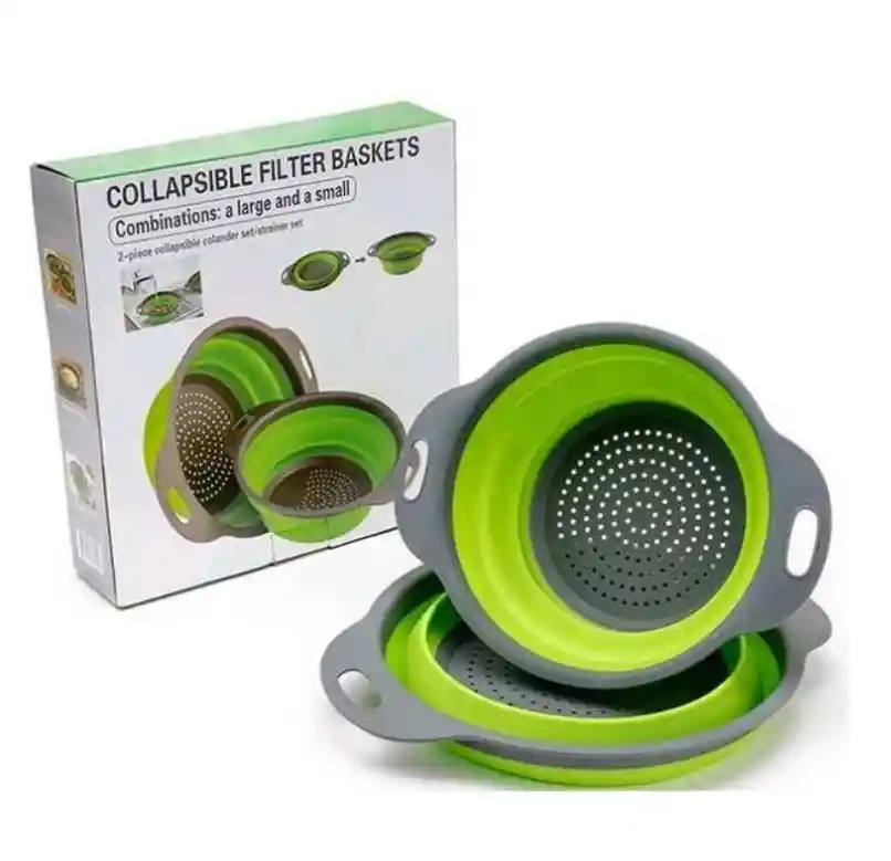 Juego de Colador en Silicona redondos Juego de dos coladores expansibles en silicona, manijas en plástico. Medidas: Colador pequeño: 19 cms de diámetro * 8 cm de profundidad. Colador grande: 24 cms de diámetro 9 cm de profundidad. Colores disponibles: verde, rojo y azul