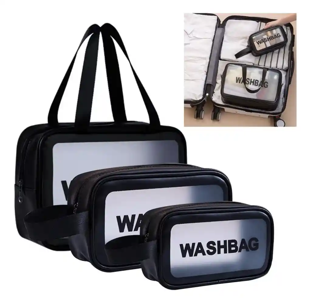 Bolsas de aseo de viaje hechas de material de poliuretano suave pero duradero y material de PVC translúcido texturizado esmerilado, impermeable y fácil de limpiar, la cremallera de metal con una gran apertura en la parte superior es muy suave y duradera, la bolsa de lavado es ligera y tiene una gran capacidad, fácil de comprimir y almacenar. Recibirás 3 tamaños de bolsa de aseo diferentes, puede contener diferentes tipos de cosas, puedes poner artículos de tocador, cosméticos, traje de baño, gafas de sol, auriculares, cargadores, etc. Te da un montón de espacio para una variedad de necesidades El material transparente visible te permite ver los artículos almacenados de un vistazo teniendo todo organizado y ahorrando tiempo. CARACTERISTICAS: Tamaños S pequeña: 22 x 8 x 12 cm M mediano: 26 x 10 x 15 cm L grande: 30 x 12 x 21 cm