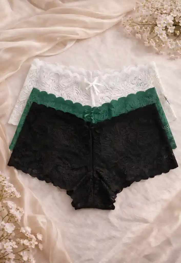 SET X3 Panty Cachetero de Encaje – Soft Lace ✨ Comodidad, elegancia y sensualidad en cada detalle. Este panty cachetero de encaje elástico está diseñado para brindarte una sensación de suavidad y libertad mientras realza tu figura con un estilo femenino y delicado. Su encaje abraza el cuerpo de forma natural, ofreciendo comodidad durante todo el día. TALLA M 💎 ¿Por qué te va a encantar? Encaje de alta calidad: suave, ligero y resistente. Ajuste perfecto: TALLA M Diseño cachetero elegante: brinda mayor cobertura sin perder el toque sensual. Ultracómodo: ideal para usar diariamente o en momentos especiales. Detalle delicado: pequeño lazo que aporta un toque femenino y sofisticado. 👗 ¿Cómo usarlo? Perfecto para usar con jeans, vestidos o ropa ajustada. Su diseño cómodo y suave hace que apenas lo sientas, mientras te permite sentirte segura y elegante en cualquier ocasión. 🛍 Lo que obtienes: Set de panties cacheteros de encaje elástico con diseño elegante. ⚡ Entrega rápida: Recíbelo entre 30 y 50 minutos después de realizar tu compra. 💬 Lo elegiría porque combina comodidad real, calidad y estilo. Es ese tipo de prenda íntima que no solo se ve hermosa, sino que también se siente increíble al usarla. 🔥 Pídelo ahora y recíbelo en minutos. Una prenda íntima diseñada para que te sientas cómoda, segura y elegante todos los días. 💫