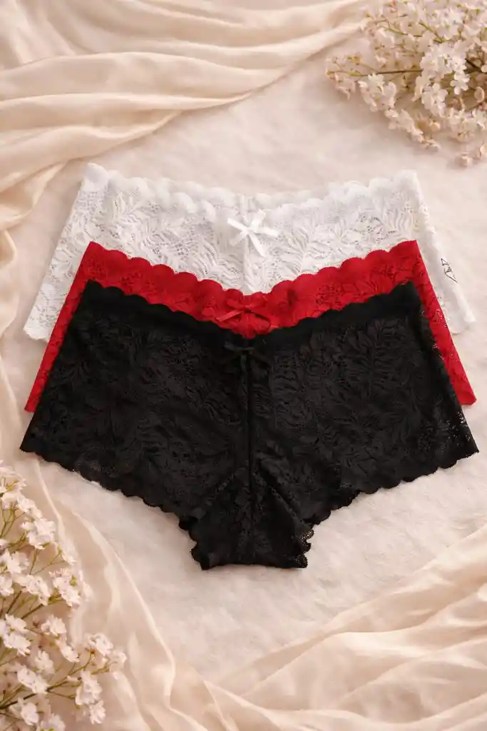 SET X3 Panty Cachetero de Encaje – Soft Lace ✨ Comodidad, elegancia y sensualidad en cada detalle. Este panty cachetero de encaje elástico está diseñado para brindarte una sensación de suavidad y libertad mientras realza tu figura con un estilo femenino y delicado. Su encaje abraza el cuerpo de forma natural, ofreciendo comodidad durante todo el día. TALLA M 💎 ¿Por qué te va a encantar? Encaje de alta calidad: suave, ligero y resistente. Ajuste perfecto: TALLA M Diseño cachetero elegante: brinda mayor cobertura sin perder el toque sensual. Ultracómodo: ideal para usar diariamente o en momentos especiales. Detalle delicado: pequeño lazo que aporta un toque femenino y sofisticado. 👗 ¿Cómo usarlo? Perfecto para usar con jeans, vestidos o ropa ajustada. Su diseño cómodo y suave hace que apenas lo sientas, mientras te permite sentirte segura y elegante en cualquier ocasión. 🛍 Lo que obtienes: Set de panties cacheteros de encaje elástico con diseño elegante. ⚡ Entrega rápida: Recíbelo entre 30 y 50 minutos después de realizar tu compra. 💬 Lo elegiría porque combina comodidad real, calidad y estilo. Es ese tipo de prenda íntima que no solo se ve hermosa, sino que también se siente increíble al usarla. 🔥 Pídelo ahora y recíbelo en minutos. Una prenda íntima diseñada para que te sientas cómoda, segura y elegante todos los días. 💫