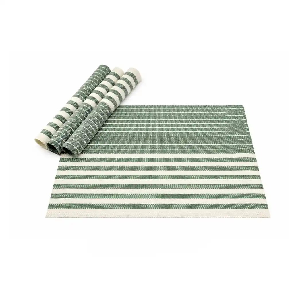 Material: 70% PVC, 30% fibra de poliéster. Diseño de rayas horizontales. Resistentes a la humedad. No se decolora por el uso. Pueden alcanzar hasta 176 °F. Se puede enrollar para almacenamiento. Protege de quemaduras y arañazos. Efecto de aislamiento térmico. Resistentes y antideslizante. Lavar con agua fría o tibia a mano. Restregar con cepillo suave. Secar al aire libre o con una toallita. Disponible en varios tonos se envía color según disponibilidad. La imagen ha sido ambientada no incluye accesorios adicionales y el color puede variar según la iluminación.