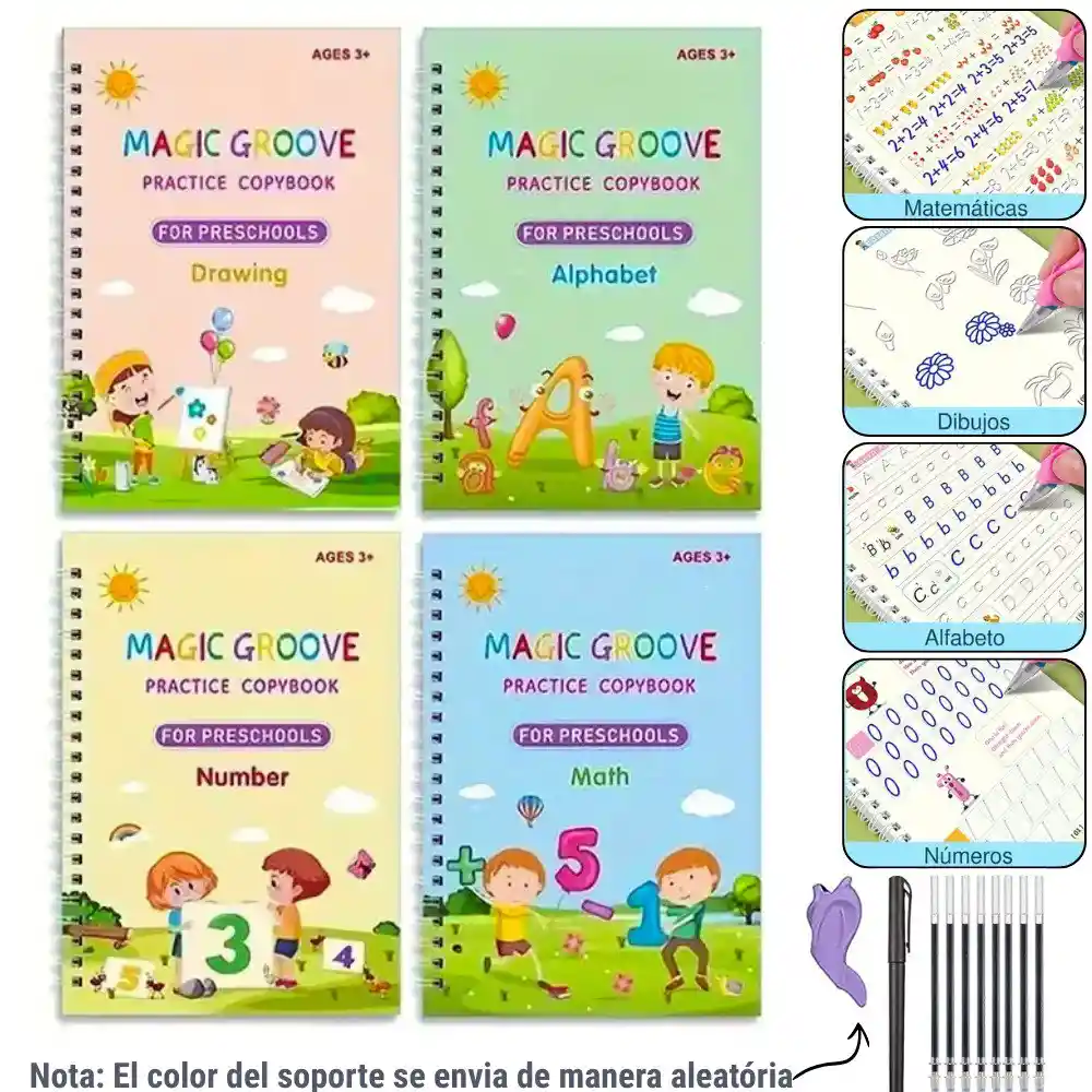 Set X4 Libretas de estudio Cuaderno Magico De Caligrafia Aprendizaje Didactico Potencia el aprendizaje temprano de tus hijos con el novedoso sistema de Escritura Mágica. Este set de 4 cartillas está diseñado con un sistema de surcos o ranuras guía que ayudan al niño a llevar el lápiz por el camino correcto, mejorando su caligrafía, motricidad fina y coordinación mano-ojo de forma automática y divertida. Características: - Tinta que Desaparece (Reutilizable): El set incluye un bolígrafo con tecnología de tinta auto-desvaneciente. Aproximadamente 15-20 minutos después de escribir, el trazo desaparece mágicamente, permitiendo que el niño practique en el mismo libro una y otra vez. - Diseño con Relieve: Las páginas tienen el trazo hundido (en bajo relieve). El niño solo debe poner el lápiz en el surco y seguir la forma, lo que garantiza una "escritura perfecta" y genera memoria muscular. - 4 Áreas de Aprendizaje: Alphabet (Alfabeto): Dominio de las letras mayúsculas y minúsculas. Number (Números): Reconocimiento numérico del 0 al 100. Math (Matemáticas): Introducción a sumas y restas básicas. Drawing (Dibujo): Formas geométricas, objetos y animales para desarrollar el arte. - Corrector de Postura: Incluye un "Grip" o agarre de silicona suave para el lápiz, enseñando al niño la forma correcta de sujetarlo. Contenido del Paquete: 4 Libros de Práctica. 1 Bolígrafo. 8 Minas/Repuestos de tinta mágica. 1 Soporte de goma para los dedos. Nota: Las imágenes publicadas son de referencia, el producto real puede presentar ligeras variaciones en el diseño de las portadas.