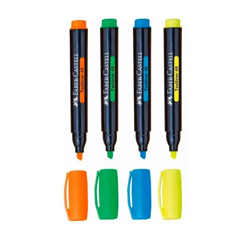 set x4 marcadores fluorescente faber castell Los resaltadores Textmarker 49 te ayudan a resaltar información importante en libros, documentos y mucho más. Por eso, son una compañía indispensable en la escuela, la universidad o el trabajo. Con sus colores súper fluorescentes y de excelente resaltado, sus puntas especiales brindan el grosor de línea perfecto para tus necesidades. Detalles del producto: -Punta biselada -Tres anchos de trazo: 4.5mm, 2.0mm y 1.4mm -Cuerpo cilíndrico -Tonos fluorescentes -Colores intensos -Larga duración -colores: amarillo, naranja, verde, celeste.