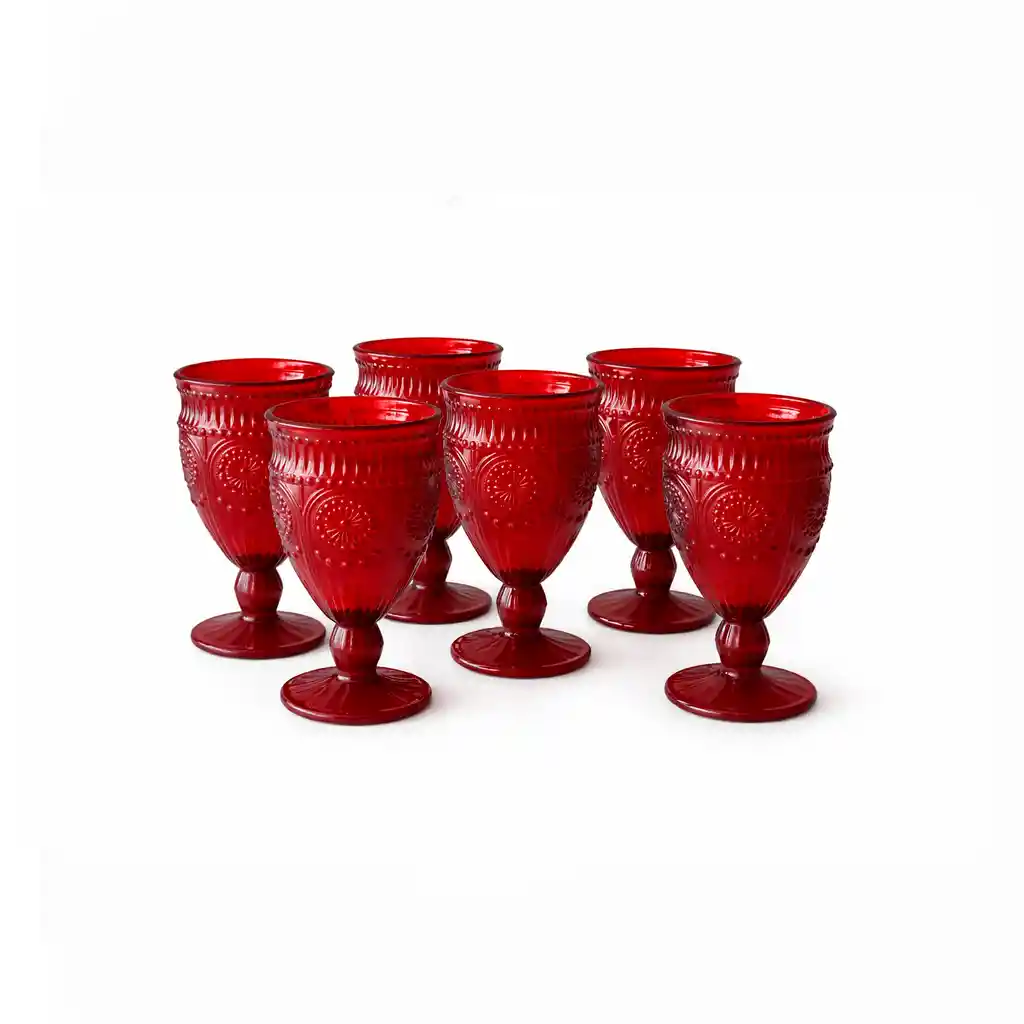 Fabricado vidrio resistente y duradero. Capacidad de 325 ml por copa (11 onz). Vidrio grueso de alta calidad. Diseño decorativo con relieve elegante. Base firme para mayor estabilidad. Acabados vintage que añaden un toque de sofisticación. Ideales para vino, agua o bebidas. No apto para lavavajillas. No absorbe olores ni sabores. Resistente al uso diario . Aportan elegancia a la mesa. Ideales para hogar, bar o restaurante. Fácil limpieza y mantenimiento. La imagen ha sido ambientada; no incluye accesorios adicionales y el color puede variar según la iluminación.