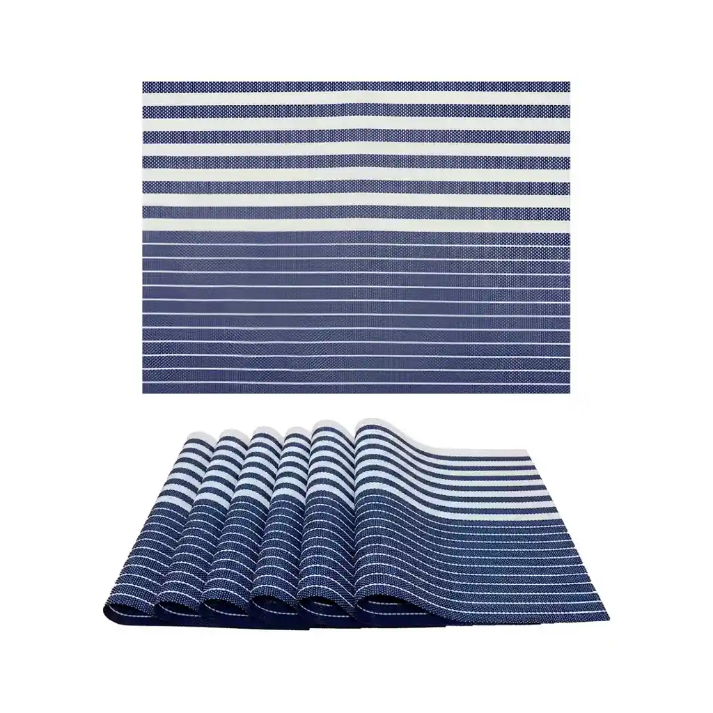 Material: 70% PVC, 30% fibra de poliéster. Diseño de rayas horizontales. Resistentes a la humedad. No se decolora por el uso. Pueden alcanzar hasta 176 °F. Se puede enrollar para almacenamiento. Protege de quemaduras y arañazos. Efecto de aislamiento térmico. Resistentes y antideslizante. Lavar con agua fría o tibia a mano. Restregar con cepillo suave. Secar al aire libre o con una toallita. Disponible en varios tonos; se envía color según disponibilidad. La imagen ha sido ambientada; no incluye accesorios adicionales y el color puede variar según la iluminación.