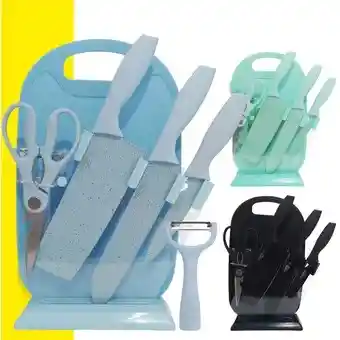 Set Completo 7 Piezas: Set de Cuchillos multiusos de cocina de Acero Inóxidable de Calidad formado por 7 piezas: Cuchillo de chef, cuchillo carnicero, cuchillo multiusos, pelador, Tijeras Polifuncionales, Tabla para Picar y Base en Acrilico. -- Duradero Fabricado En Acero Inoxidable: Este juego de cuchillos de cocina es de alta calidad, las cuchillas están fabricadas en acero inóxidable lo que las mantiene afiladas durante más tiempo. Los cuchillos están equilibrados para su mejor estabilidad en el corte. El acero inóxidable es duradero, resistente y no se oxida con los cuidados adecuados. -- Revestimiento De Color Antiadherente: El revestimiento de color antiadherente y antibacteriano evita que la comida se pegue en la hoja permitiendo un corte más rápido y fácil. -- Mango Ergonómico Y Antideslizante: Los mangos ergonómicos antideslizantes ofrecen un agarre cómodo y seguro para facilitar el corte de alimentos. -- Fácil Limpieza: Los cuchillos son fáciles de limpiar, puedes limpiar los cuchillos utilizando un paño húmedo, no aptos para lavavajillas.
