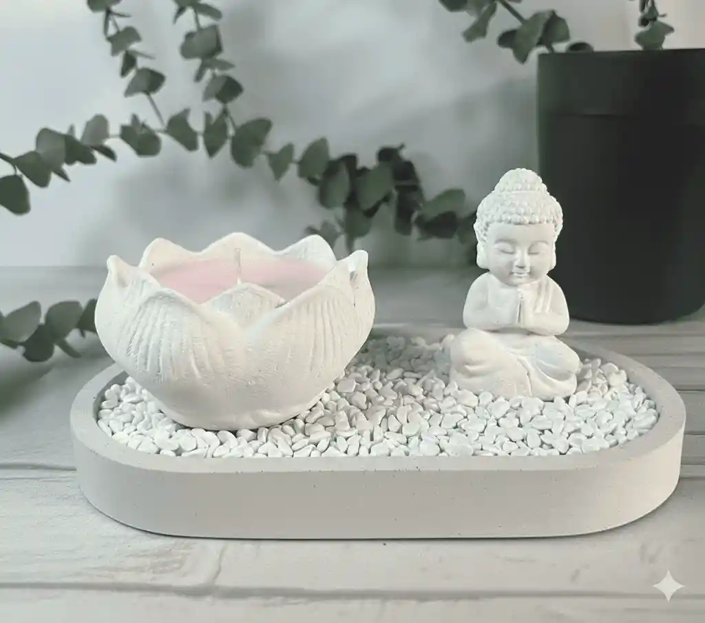 SET ZEN Bandeja + Escultura Buda + Piedras decorativas + Vela Bandeja de 18 cm Material concreto Color Blanco