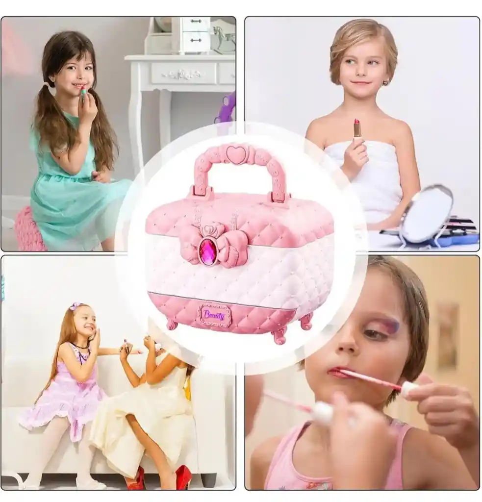 Maletín de Maquillaje Infantil Dream Fashion Hermoso set de maquillaje lavable para niñas, presentado en un elegante maletín portátil con diseño acolchado y asa. Incluye esmaltes, brochas, labiales y accesorios para jugar y crear looks divertidos. Ideal como regalo, fomenta la creatividad y el juego imaginativo. Material seguro y fácil de limpiar.