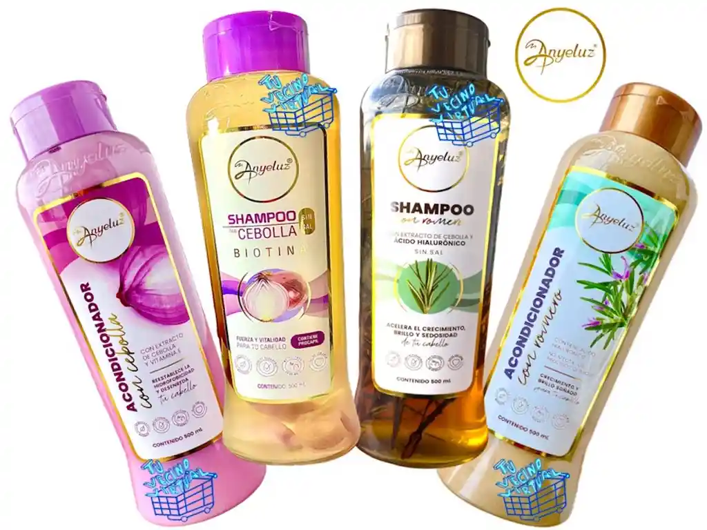En tu vecino virtual también encontraras : Anyeluz, syam cosmetic, piel de oro, Kaba, class gold, lampiña, Te verde de matcha Benefit, te plus, te latte, te negro, milagros , exfoliante, aceite de coco, pomada alfa, colageno hidrolizado,vinipel osmótico, Rodillo de jaba arrugas, Bioaqua Acne, Mascarillas,tónico, Magic Hair, funat y muchos mas —————————————————————————————————————————————————— SHAMPOO CON ROMERO ANYELUZ El Nuevo Shampoo de Romero llega a la línea capilar de Anyeluz, con extracto de cebolla, ácido hialurónico y romero por dentro. Ideal para acelerar el crecimiento, darle brillo y sedosidad a tu cabello. SHAMPOO DE CEBOLLA ANYELUZ Está compuesto principalmente de cebolla roja, la cual contiene quercetina (que son pigmentos naturales con poderosos antioxidantes), esta mejora la resistencia del cabello; impidiendo su ruptura y descamación. Su aporte de azufre estimula el flujo sanguíneo y actúa como antiinflamatorio. Asimismo, el shampoo es sin sal y libre de parabenos, limpia y reduce la grasa, las irritaciones del cuero cabelludo activando el flujo sanguíneo, haciendo que el folículo piloso se abra también iniciando un crecimiento sano y fuerte, aporta brillo y es apto para todo tipo de cabello (incluyendo niños), lo puedes usar cada vez que desees lavarte el cabello. ACONDICIONADOR DE CEBOLLA ANYELUZ El nuevo Acondicionar de Cebolla cuenta con extracto de cebolla y Vitamina E. Restablece la hidrofobicidad y desenreda el cabello con facilidad. Mejora las propiedades del cabello dejándolo sedoso, revitalizado y fácil de peinar ACONDICIONADOR CON ROMERO ANYELUZ El nuevo Acondicionador con Romero Anyeluz® es el complemento perfecto para obtener un cabello suave, brillante, con apariencia saludable y fácil de peinar. Gracias a la cuidadosa combinación de Ácido Hialurónico y Extractos naturales conseguirás fuerza, nutrición y vitalidad en tu fibra capilar, a la vez que tendrás un cabello sedoso y manejable.