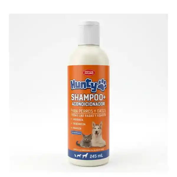 Hunty Shampoo + Acondicionador Hunty Shampoo + Acondicionador está diseñado para lavar y acondicionar en un solo paso. Limpia y suaviza el pelaje de su mascota. Nutre y fortalece el pelo desde la raíz, dejándolo muy suave, brillante, con agradable aroma y fácil de cepillar.