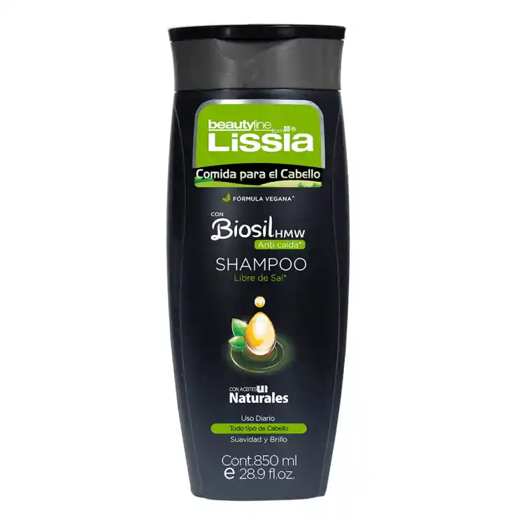 SHAMPOO ANTICAIDA BIOSIL LISSIA Comida Para el Cabello Contiene: 850ml Shampoo libre de sal que limpia, repara y ayuda a prevenir la caída del cabello logrando un cabello visiblemente más sano. Disfruta de un Shampoo con Biosil HMW el cual es un Complejo humectante y nutriente rico en vitaminas, aceites esenciales y humectantes que ayudan a restaurar la fibra y a prevenir la caída* del cabello. Para un cabello aún más increíble experimenta toda la línea de Comida para el Cabello. MODO DE USO: Colócalo en la mano, aplícalo sobre el cabello húmedo, masajea suavemente y luego enjuaga. Repite si es necesario.
