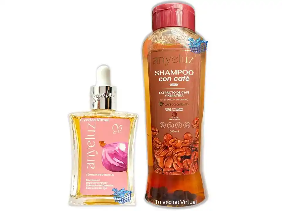 En tu vecino virtual también encontraras : Anyeluz, syam cosmetic, piel de oro, Kaba, class gold, lampiña, Te verde de matcha Benefit, te plus, te latte, te negro, exfoliante, aceite de coco, pomada alfa, colageno hidrolizado,vinipel osmótico, Bioaqua Acne, Mascarillas,tónico, Trendy, la pocion, HGW y muchos mas ————————————————————————————————————————————————— Shampoo Con Café Anyeluz Nuestro Shampoo de Café tiene una poderosa fórmula enriquecida con extractos naturales de café y keratina para un cabello más fuerte, brillante y sin frizz. Su acción antioxidante y detox permite una limpieza profunda, eliminando exceso de grasa e impurezas, mientras fortalece los folículos y estimula un crecimiento más denso y saludable. Gracias a sus propiedades anticaída y revitalizantes, aporta suavidad y cuerpo, siendo la opción ideal para quienes buscan combatir la caída del cabello de manera natural y beneficiarse del uso de la cafeína por sus cabellos finos o débiles. Beneficios Potenciales Ayuda a proteger el cabello del daño causado por cambios radicales. Previene el envejecimiento capilar gracias a su acción detox. Nutre y revitaliza la fibra capilar, dejando el cabello más manejable. Refuerza la estructura capilar desde la raíz, reduciendo el quiebre. Su fórmula con cafeína despierta el cuero cabelludo y deja una fragancia deliciosa a café. Es una alternativa sin químicos agresivos para estimular el crecimiento capilar. Modo de uso: 1.Moja el cabello y aplica el shampoo de café sobre el cuero cabelludo. Masajea suavemente durante 2 a 3 minutos para que la cafeína penetre en los folículos. Luego enjuaga completamente. Se recomienda usarlo 2 a 3 veces por semana para potenciar sus efectos. Contenido: 500mL ______________________________________________________ TÓNICO CAPILAR PARA EL CRECIMIENTO DEL CABELLO ANYELUZ Descripción: Por su actividad epigenética, estimula las células capilares, previene la caída capilar, es adecuado para el tratamiento energizante de cabellos debilitados y finos. Fuente de energía para las células de la piel. Promueve la reparación y defensa celular; Genera un efecto anti-edad sobre el cabello, estimulando el metabolismo del folículo capilar lo que lleva a aumentar la densidad capilar de hombres y mujeres. Gracias a sus componentes activos, reduce visiblemente la caspa, alivia el picor del cuero cabelludo e hidrata y reduce la producción de sebo. El tónico capilar está compuesto de extractos de cebolla y ajo. Modo de uso: Antes de la aplicación del tónico de cebolla marca Aanyeluz®, lavar el cabello con el SHAMPOO DE CEBOLLA ANYELUZ®. Rociar la cantidad deseada en el cuero cabelludo, realizando masajes con las yemas de los dedos para promover la absorción. Utilizarlo preferiblemente en las noches y en las mañanas. Presentación: 50 ml Registro Invima : NSOC94085-19CO