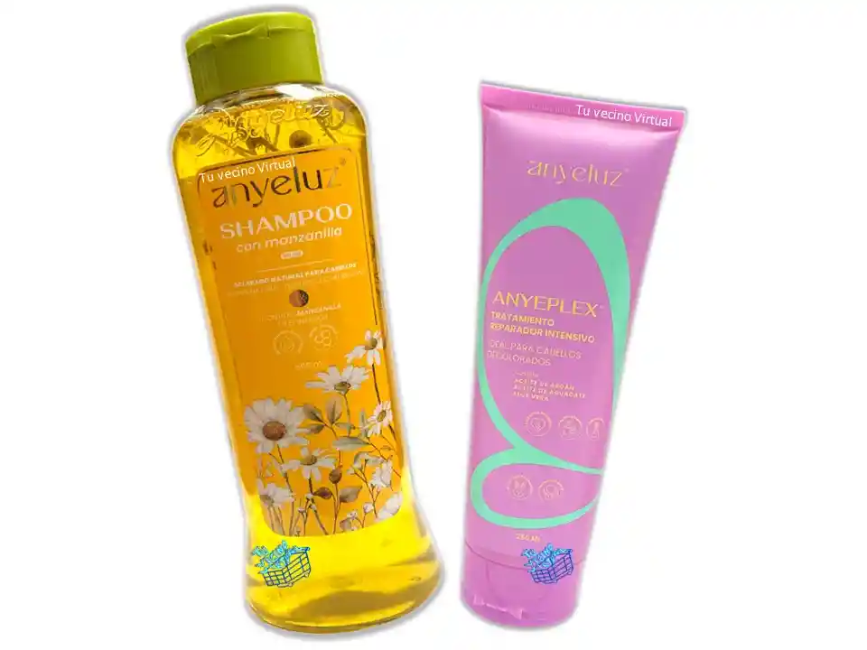 En tu vecino virtual también encontraras : Anyeluz, syam cosmetic, piel de oro, Kaba, class gold, lampiña, Te verde de matcha Benefit, te plus, te latte, te negro, exfoliante, aceite de coco, pomada alfa, colageno hidrolizado,vinipel osmótico, Bioaqua Acne, Mascarillas,tónico, Trendy, la pocion, HGW y muchos mas ————————————————————————————————————————————————— ———————————————————————————————————— Anyeplex profesional tratamiento reparador intensivo Su fórmula única, enriquecida con ingredientes especializados, penetra profundamente en la fibra capilar para: -Reponer los aminoácidos perdidos -Reparar el daño desde el interior -Hidratar en profundidad -Reducir el frizz y el quiebre -Devolver al cabello su sedosidad, brillo y movimiento natural Contenido : 250 mL ----------------------------------------------------------------------- Shampoo Con Manzanilla Anyeluz Shampoo de manzanilla, elaborado con extracto natural de flor de manzanilla. Aclara de forma sutil el cabello y realza los tonos rubios naturales, teñidos o con mechas. Su fórmula suave equilibra los aceites del cuero cabelludo, reduce la caspa y calma irritaciones, dejando el cabello brillante, sedoso y revitalizado. Es ideal para cabellos claros y sensibles que buscan un cuidado natural, ¡incluso para los más pequeños! Beneficios Potenciales Aclara el cabello de forma natural y gradual, sin dañar la fibra capilar. Ayuda a reducir la irritación y combatir la caspa gracias a sus propiedades antiinflamatorias. Nutre y revitaliza, dejando el cabello más manejable, brillante y sedoso. Mantiene el cuero cabelludo fresco y saludable sin resecarlo. Resalta los tonos rubios y castaños claros, potenciando los reflejos dorados. Perfecto para quienes buscan un cuidado capilar sin químicos agresivos. Modo de uso: 1.Moja el cabello y aplica una cantidad moderada de shampoo 2.Masajea suavemente el cuero cabelludo durante 1 a 2 minutos para activar sus propiedades. 3.Deja actuar un par de minutos y enjuaga con abundante agua. 4.Recomendado de 2 a 3 veces por semana para mejores resultados. Contenido: 500mL