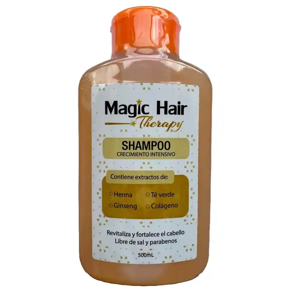 Shampoo para Crecimiento del Cabello sin Sal El Shampoo para crecimiento del cabello sin sal de Magic Hair, enriquecido con extractos naturales seleccionados que revitalizan, fortalecen, dan crecimiento y cuidan el cabello maltratado. Además los extractos del shampoo para crecimiento del cabello te brindan suavidad e hidratación. El contenido del ¨Shampoo para Crecimiento del Cabello sin Sal¨ consta de Tensioactivos, los cuales te brindan una limpieza profunda sin maltratar el cuero cabelludo. Puede ser empleado tanto por hombres, como por mujeres y niños. Champú sin sal ni parabenos. ¿Que beneficios tiene el shampoo Magic Hair? Promueve el crecimiento de nuevos cabellos. Acelera el crecimiento del cabello ya existente. Disminuye la horquilla. Resultados desde la primera aplicación. Aroma que perdura en el cabello. Lo mantiene limpio por más tiempo. Proporciona brillo inmediato. INGREDIENTES PRINCIPALES Contiene extractos de henna, té verde, ginseng y colágeno. FORMA DE APLICACIÓN ¿Cabello seco? Aplicar y masajear de raíz a puntas. ¿Cabello graso? Aplicar y masajear de raíz a medios. Deje actuar durante 5 minutos y enjuagar con abundante agua (FRÍA), luego aplicar acondicionador.