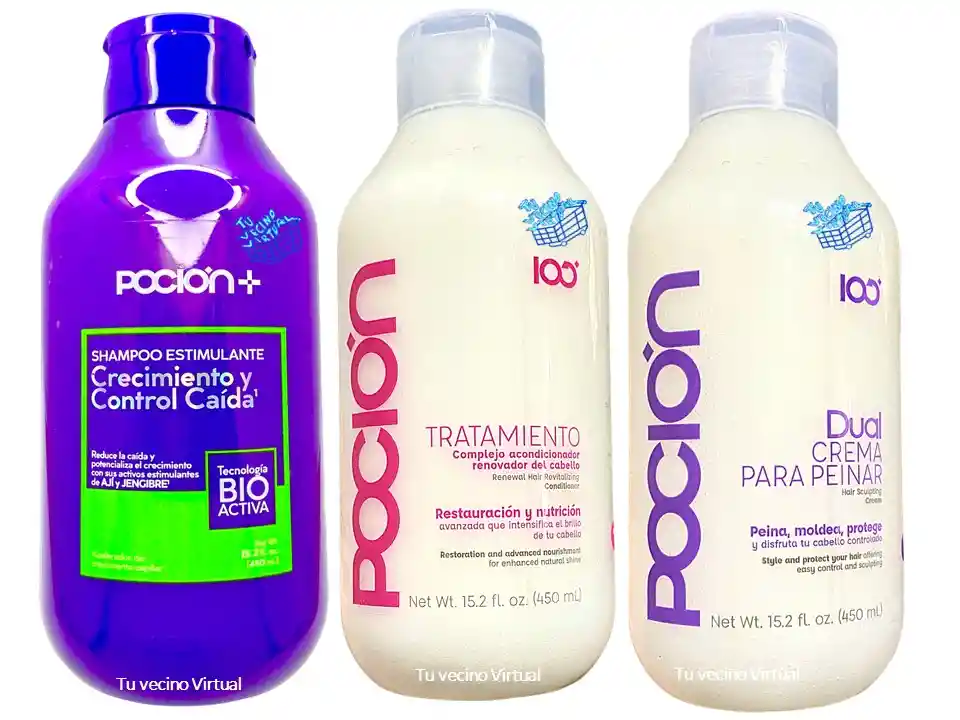 En tu vecino virtual también encontraras : Anyeluz, syam cosmetic, piel de oro, Kaba, class gold, lampiña, Te verde de matcha Benefit, te plus, te latte, te negro, exfoliante, aceite de coco, pomada alfa, colageno hidrolizado,vinipel osmótico, Bioaqua Acne, Mascarillas,tónico, Trendy, la pocion, HGW y muchos mas ————————————————————————————————————————————————— ——————————————————————————— Tratamiento la poción Tratamiento en crema con 15 proteínas y aminoácidos, capaz de regenerar toda la estructura del cabello, mejorando la apariencia interna y externa desde la primera aplicación gracias a sus componentes activos de liberación inmediata. Contiene : 440 mL Invima :NSOC85573-18CO *Antes de realizar la compra verifica que tus datos correspondan donde quieres que se realice la entrega de tus productos Cualquier inquietud escríbenos estamos atentos . ——————————————————————————————————— Crema para peinar DUAL CREMA para peinar DUAL, da forma al cabello mientras repara el daño (de aquí su nombre Dual), su función es hidratar, aportar brillo, suavidad y control antifrizz. Puede ser usada en todo tipo de cabello Contiene : 440 mL Invima :NSOC13831-22CO ----------------------------------------------------------------------------------------------------- Poción+ Shampoo Crecimiento y Control Caida Shampoo Estimulante Crecimiento y Caída con tecnología bioactiva y alto índice de biodegradabilidad. La mezcla única de ingredientes naturales de Ají, Jengibre y Trébol Rojo revitaliza los folículos capilares desde la raíz, acelerando las fases de crecimiento capilar asegurando así, un crecimiento continuo y robusto al mismo tiempo que combate y detiene la caída del cabello. Modo de uso: Humedece el cabello, aplica y distribuye sobre el cuero cabelludo realizando masajes circulares con la yema de los dedos, enjuaga y repite el proceso de ser necesario Contenido : 450 mL