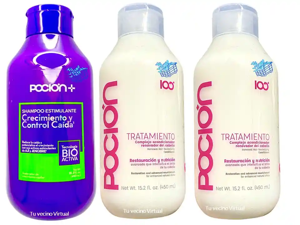 En tu vecino virtual también encontraras : Anyeluz, syam cosmetic, piel de oro, Kaba, class gold, lampiña, Te verde de matcha Benefit, te plus, te latte, te negro, exfoliante, aceite de coco, pomada alfa, colageno hidrolizado,vinipel osmótico, Bioaqua Acne, Mascarillas,tónico, Trendy, la pocion, HGW y muchos mas ————————————————————————————————————————————————— ----------------------------------------------------------------------------------------------------- Poción+ Shampoo Crecimiento y Control Caida Shampoo Estimulante Crecimiento y Caída con tecnología bioactiva y alto índice de biodegradabilidad. La mezcla única de ingredientes naturales de Ají, Jengibre y Trébol Rojo revitaliza los folículos capilares desde la raíz, acelerando las fases de crecimiento capilar asegurando así, un crecimiento continuo y robusto al mismo tiempo que combate y detiene la caída del cabello. Modo de uso: Humedece el cabello, aplica y distribuye sobre el cuero cabelludo realizando masajes circulares con la yema de los dedos, enjuaga y repite el proceso de ser necesario Contenido : 450 mL _______________________________ Tratamiento la poción Tratamiento en crema con 15 proteínas y aminoácidos, capaz de regenerar toda la estructura del cabello, mejorando la apariencia interna y externa desde la primera aplicación gracias a sus componentes activos de liberación inmediata. Contiene : 440 mL Invima :NSOC85573-18CO