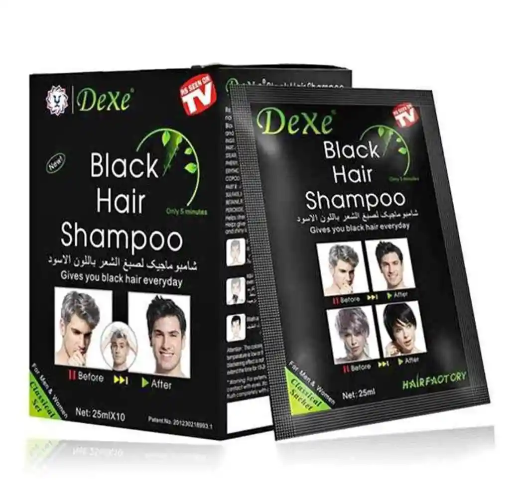 Shampoo cubre canas, contiene ingredientes naturales sin amoniaco, ni químicos color negro, dura hasta 30 días se aplica como un shampoo y se deja por 15 minutos, luego se enjuaga con abundante agua. la caja viene por 10 sobres, cada sobre dura entre una y dos aplicaciones dependiendo del largo del cabello