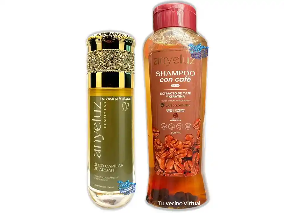 En tu vecino virtual también encontraras : Anyeluz, syam cosmetic, piel de oro, Kaba, class gold, lampiña, Te verde de matcha Benefit, te plus, te latte, te negro, exfoliante, aceite de coco, pomada alfa, colageno hidrolizado,vinipel osmótico, Bioaqua Acne, Mascarillas,tónico, Trendy, la pocion, HGW y muchos mas ————————————————————————————————————————————————— Shampoo Con Café Anyeluz Nuestro Shampoo de Café tiene una poderosa fórmula enriquecida con extractos naturales de café y keratina para un cabello más fuerte, brillante y sin frizz. Su acción antioxidante y detox permite una limpieza profunda, eliminando exceso de grasa e impurezas, mientras fortalece los folículos y estimula un crecimiento más denso y saludable. Gracias a sus propiedades anticaída y revitalizantes, aporta suavidad y cuerpo, siendo la opción ideal para quienes buscan combatir la caída del cabello de manera natural y beneficiarse del uso de la cafeína por sus cabellos finos o débiles. Beneficios Potenciales Ayuda a proteger el cabello del daño causado por cambios radicales. Previene el envejecimiento capilar gracias a su acción detox. Nutre y revitaliza la fibra capilar, dejando el cabello más manejable. Refuerza la estructura capilar desde la raíz, reduciendo el quiebre. Su fórmula con cafeína despierta el cuero cabelludo y deja una fragancia deliciosa a café. Es una alternativa sin químicos agresivos para estimular el crecimiento capilar. Modo de uso: 1.Moja el cabello y aplica el shampoo de café sobre el cuero cabelludo. Masajea suavemente durante 2 a 3 minutos para que la cafeína penetre en los folículos. Luego enjuaga completamente. Se recomienda usarlo 2 a 3 veces por semana para potenciar sus efectos. Contenido: 500mL —————————————————————————————————————————————————— ÓLEO CAPILAR DE ARGÁN ANYELUZ El Óleo Capilar de Argán es un producto rico en nutrientes y vitaminas, que ayudan a la regeneración en los enlaces del cabello y es 100% orgánico (tiene el sello internacional COSMOS ORGANIC). - Nutre y revitaliza el cuero cabelludo. - Fortalece el cabello proporcionando brillo, suavidad y un efecto sedoso. - Forma una película protectora de radicales libres, ayudando a combatirlos, gracias al aceite de argán. - Promueve la regeneración del cabello. - Gracias a los componentes de la formulación promueve el acondicionamiento del cabello. - Regulación seborreica en las pieles grasas. - Mejora las puntas abiertas y las escamas del cabello. Modo de uso: Aplicar en la palma de la mano y distribuir suavemente en toda la extensión del cabello, puedes aplicarlo en cabello seco o húmedo. Invima:NS0C96841-19C0 Contenido : 100mL