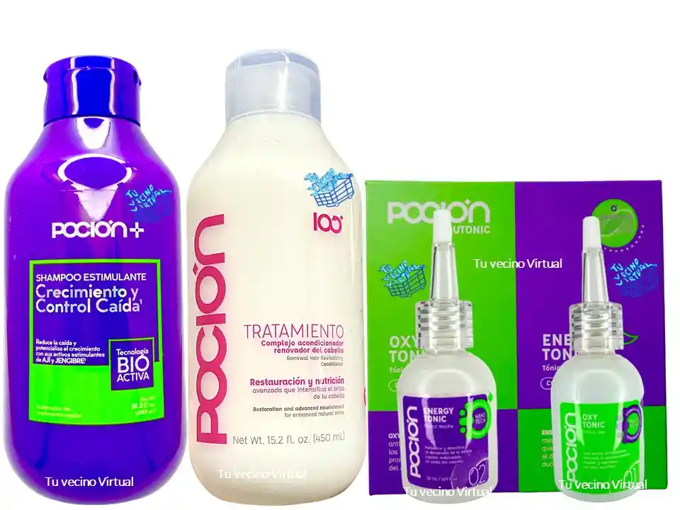En tu vecino virtual también encontraras : Anyeluz, syam cosmetic, piel de oro, Kaba, class gold, lampiña, Te verde de matcha Benefit, te plus, te latte, te negro, exfoliante, aceite de coco, pomada alfa, colageno hidrolizado,vinipel osmótico, Bioaqua Acne, Mascarillas,tónico, Trendy, la pocion, HGW y muchos mas ————————————————————————————————————————————————— —————————————— Shampoo Crecimiento y Control Caída La poción Shampoo Estimulante Crecimiento y Caída con tecnología bioactiva y alto índice de biodegradabilidad. La mezcla única de ingredientes naturales de Ají, Jengibre y Trébol Rojo revitaliza los folículos capilares desde la raíz, acelerando las fases de crecimiento capilar asegurando así, un crecimiento continuo y robusto al mismo tiempo que combate y detiene la caída del cabello. Modo de uso: Humedece el cabello, aplica y distribuye sobre el cuero cabelludo realizando masajes circulares con la yema de los dedos, enjuaga y repite el proceso de ser necesario Contenido : 450 mL ——————————————————————————— Tratamiento la poción Tratamiento en crema con 15 proteínas y aminoácidos, capaz de regenerar toda la estructura del cabello, mejorando la apariencia interna y externa desde la primera aplicación gracias a sus componentes activos de liberación inmediata. Contiene : 440 mL Invima :NSOC85573-18CO *Antes de realizar la compra verifica que tus datos correspondan donde quieres que se realice la entrega de tus productos Cualquier inquietud escríbenos estamos atentos . ———————————————————————————————————— DUTONIC – KIT ANTICAÍDA Y CRECIMIENTO CAPILAR La Pocion DUTONIC es un tratamiento con nanotecnología liposomal, capaz de transportar y liberar eficientemente sus ingredientes en la zona afectada. Sus activos y extractos naturales brindan cohesión y fuerza en el desarrollo de las hebras capilares. Su ritual de aplicación día y noche crean la rutina perfecta para dar solución a la caída del cabello y al mismo tiempo acelera el proceso de crecimiento del cabello DUTONIC densifica las hebras capilares mediante una correcta oxigenación sanguínea, a la vez que estimula la microcirculación en los folículos pilosos y, acelera el nacimiento de nuevos cabellos, extendiendo la fase anágena. Contiene OXYTONIC para aplicar al iniciar tu rutina diurna y ENERGYTONIC en tu rutina nocturna. Contenido : 50 mL - ud. INVIMA: NSOC13407-22CO