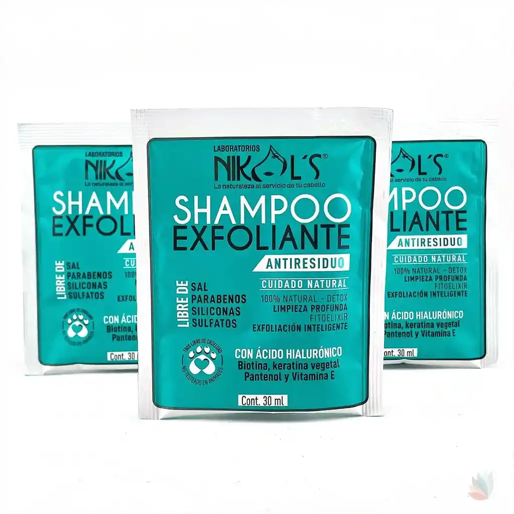 x1 sachet- 30ml Shampo exfoliante con ÁCIDO HIALURÓNICO, BIOTINA, KERATINA HIDROLIZADA, PANTENOL Y VITAMINA E