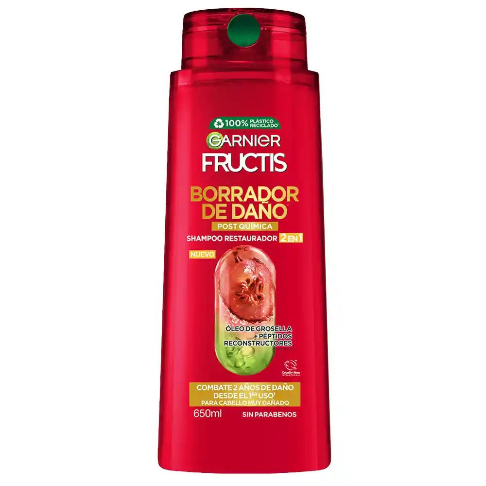 Fructis Borrador de Daño Post Química, con su poderosa combinación de Óleo de Grosella que hidrata intensament...Ver más