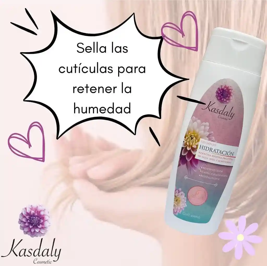 SHAMPOO HIDRATACIÓN KASDALY 400 ML : Shampoo capilar ideal para cabellos maltratados, con extractos naturales, embrión de pato, keratina, proteína de seda. Fortalece la raíz del cuero cabelludo dándole brillo y suavidad. Su fórmula con extractos naturales y algas marinas, fortalece el folículo piloso, dándole fuerza y vitalidad, evitando su caída. Ingredientes: keratina, biotina, proteína de seda, miel y almendras. Modo de uso: aplique en el cabello en forma de masajes con la yema de los dedos y déjelo actuar durante 10 minutos masajeando suavemente. Enjuague y repita si es necesario. Precauciones y advertencias: mantenga fuera del alcance de los niños. Solo para uso externo. En caso de contacto con los ojos, enjuague con abundante agua. En caso de observar alguna reacción externa, suspenda su uso y consulte a su médico.