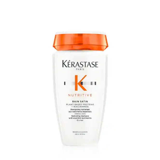 Shampoo Hidratante y Nutritivo Bain Satin Kérastase 250ml Cabello Seco Shampoo Hidratante y Nutritivo Bain Satin Kérastase es un shampoo hidratante para cabello seco. El cabello seco se debe nutrir y reforzar por lo que gracias a su nueva formula con proteínas limpia profundamente el cabello seco, restaura el grosor y brillo del cabello mientras mejora su hidratación, su proceso de retención de humedad suaviza el cabello. SHAMPOO HIDRATANTE Y NUTRITIVO – CONSIGUE UN CABELLO FUERTE, HIDRATADO Y SALUDABLE Este shampoo hidratante revitaliza y fortalece el cabello para luchar contra la deshidratación. Nutritive Bain Satin tiene una textura de gel cremoso blanco y proporciona un resultado ligero, lo que lo convierte en el mejor champú para cabello seco. BENEFICIOS Revitaliza y fortalece el cabello para combatir la deshidratación Restaura el grosor y el brillo del cabello Aporta más estructura y fuerza al cabello Hasta +44%* de hidratación inmediata y 72h de nutrición.* Botella fabricada con un 95% de plástico reciclado. *Resultados de pruebas instrumentales después de la aplicación de Bain Satin Rutina Nutritive La icónica gama Nutritive de Kérastase, un cuidado nutritivo diseñado para hacer que el cabello sea dócil e irresistiblemente suave al tacto, actúa sobre el núcleo de los problemas del cabello seco con una rutina personalizada para tres niveles de sequedad. INGREDIENTES Proteínas de origen vegetal Niacinamida Glicerina En este champú proteico, los cereales integrales de trigo, maíz y soja actúan como suplemento dietético. Mezclados con ácidos grasos, omega y vitaminas, alimentan el cabello con nutrientes esenciales.Un derivado de la vitamina B3 que bloquea la nutrición, lo que hace que este champú de niacinamida sea capaz de fortalecer la barrera de fibra para una salud duradera. De origen vegetal, la glicerina potencia la acción hidratante global de la fórmula. CONSEJO DE APLICACIÓN SHAMPOO BAIN SATIN PASO 1 Aplicar sobre el cabello húmedo. PASO 2 Hacer espuma. PASO 3 Enjuague y repita. En caso de contacto con los ojos, enjuáguelos inmediata y abundantemente. Si se produce irritación, reduzca la frecuencia de uso.