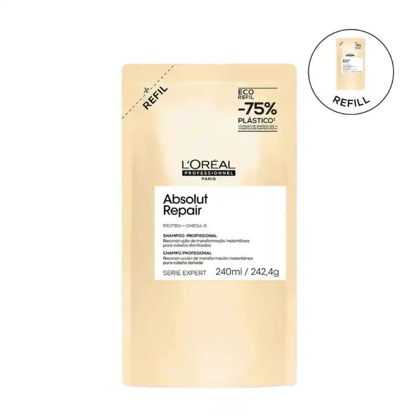 El Omega 9 + PROTEÍNA, reduce los daños en la superficie del cabello un 77%* y aporta un cabello 7 veces más brillante**, al mismo tiempo que deja un toque de ligereza y suavidad *Shampoo + Mascarilla reparadora y fortalecedora después de 5 aplicaciones **Shampoo + máscarilla Dorada Reestructurante Frente Al Champú Clásico Shampoo Profesional Absolut Repair de Loreal para cabello dañado. L'Orea Professionnel Paris Serie Expert L’Oreal Professionnel Serie Expert ABSOLUT REPAIR, para una reparación profesional al instante. BENEFICIOS ABSOLUT REPAIR Limpia el cabello Reestructura cabello dañado Reduce los daños en la superficie Mas brillo Deja toque Ligero CONSEJOS DE APLICACIÓN SHAMPOO ABSOLUT REPAIR Aplicar de manera uniforme sobre el cabello mojado. Espuma. Dejar actuar por 2 minutos y luego enjuagar Para mejores resultados usar acondicionador o mascarilla de Absolut Repair