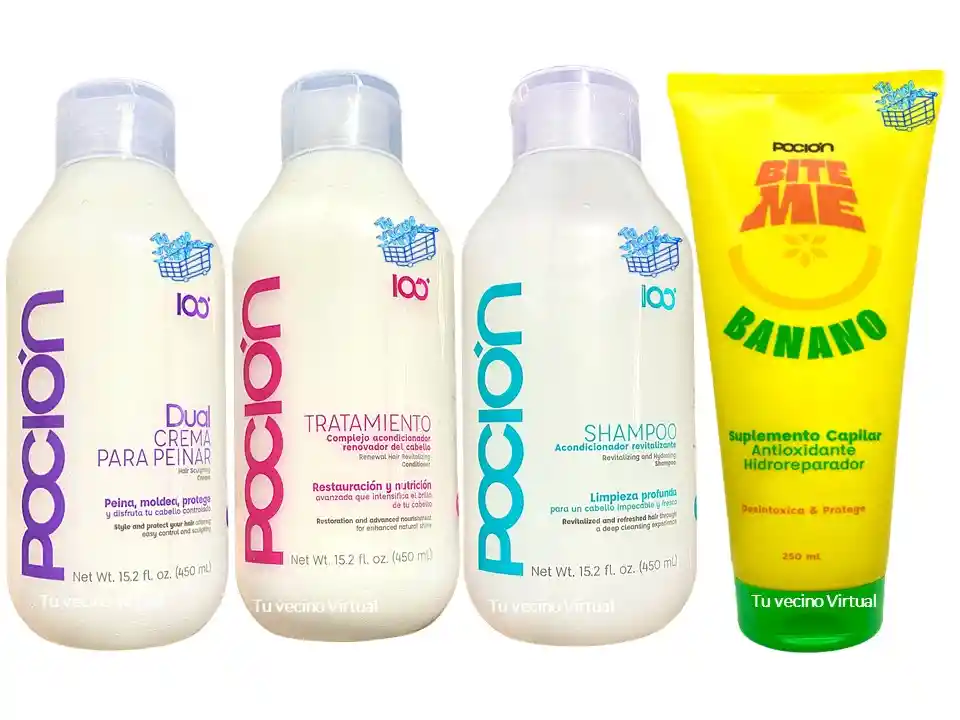 En tu vecino virtual también encontraras : Anyeluz, syam cosmetic, piel de oro, Kaba, class gold, lampiña, Te verde de matcha Benefit, te plus, te latte, te negro, exfoliante, aceite de coco, pomada alfa, colageno hidrolizado,vinipel osmótico, Bioaqua Acne, Mascarillas,tónico, Trendy, la pocion y muchos mas ————————————————————————————————————————————————— Poción Shampoo es una poderosa combinación de ingredientes diseñados para mantener la vitalidad de tu cabello. Nuestro shampoo brindará frescura y una limpieza profunda, aportando a tu cabello salud y regeneración promoviendo un sano crecimiento. Poción Tratamiento Acondicionador es una fórmula especial con 15 protéinas y aminoácidos capaz de corregir daños ocasionados por procesos químicos. Hidrata y regenera cabellos opacos, porosos y maltratados, mejora la apariencia interna y externa de tu cabello desde la primera aplicación. Poción crema de peinar DUAL, es una fórmula especializada para desenredar y dar forma a tu cabello. Nuestros ingredientes nutren y protegen el cabello de agresiones externas, alineando las hebras capilares, sellando las cutículas, mejorando la peinabilidad y asegurando un buen acabado, dando como resultado final un excelente control del frizz sin general peso cosmético. ¡Bite Me es una mascarilla que vas a querer comértela! Está especialmente diseñada para cabellos frágiles, opacos y gravemente dañados por la degradación de proteínas ocasionadas por el exceso de alisados, decoloraciones, exposición constante a altas temperaturas y envejecimiento capilar. Su ingrediente activo 99,5% de origen natural, extraído del Banano con las combinación de aceites de Macadamia, Algodón y Aguacate, logran reponer las proteínas perdidas a diario para que tu cabello esté sano, fuerte, hidratado y protegido, tanto en la estructura interna como externa del cabello.